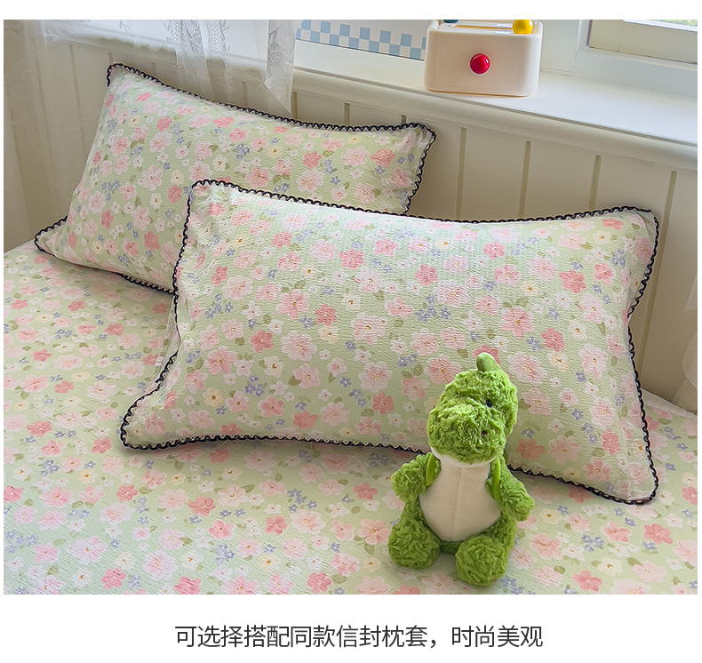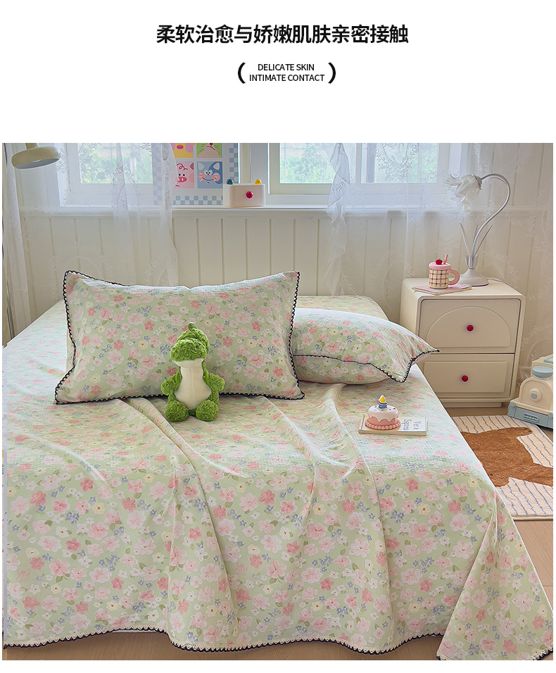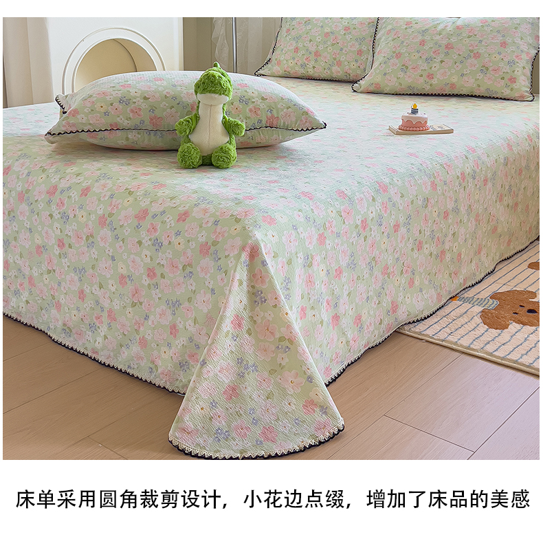 三盛源 2025新款韩版碎花皱皱双层纱镂空花边水洗棉单床单床单单件 莱茵-绿