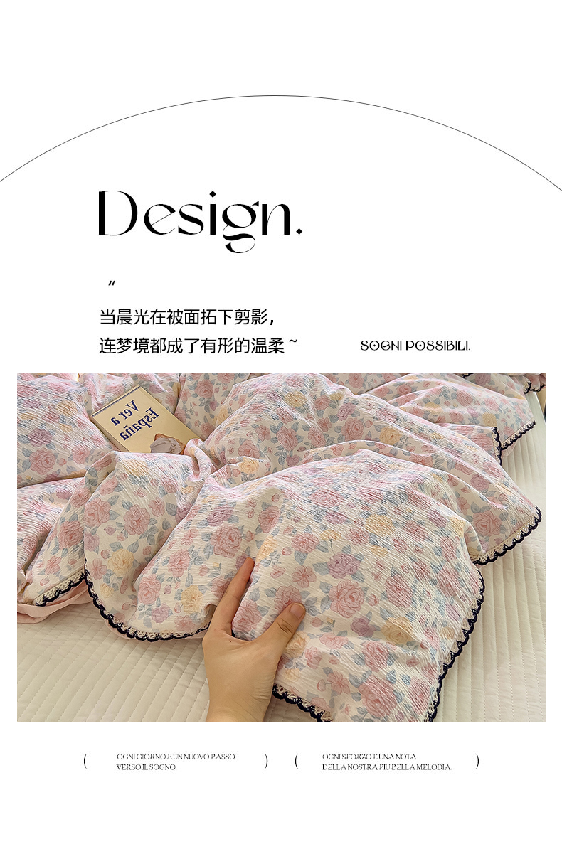 • 91家纺网 家纺一手货源 找家纺 三盛源 2025新款韩系小花卉镂空花边超柔皱皱双层纱水洗棉单被套被套单件 桃粉