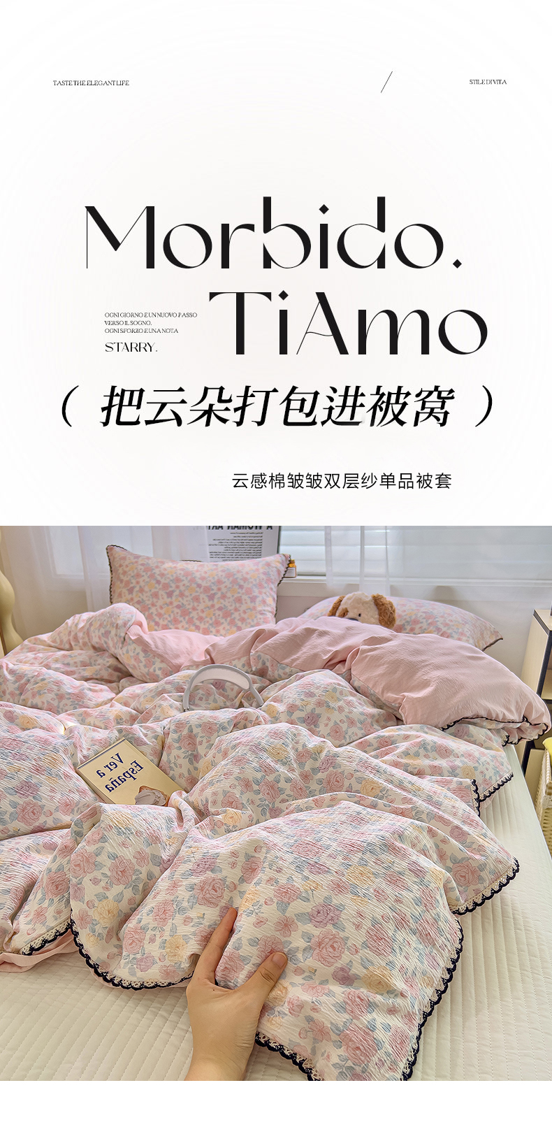 (总)三盛源 2025新款韩系小花卉镂空花边超柔皱皱双层纱水洗棉单被套被套单件,绿野,萌趣小窝,奶油星点,泡芙小狗,桃粉,絮语,紫萝漫想,紫米樱桃