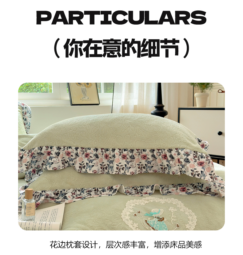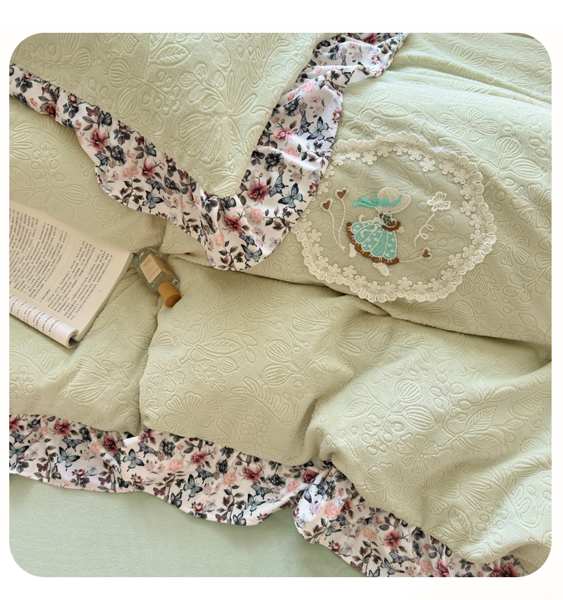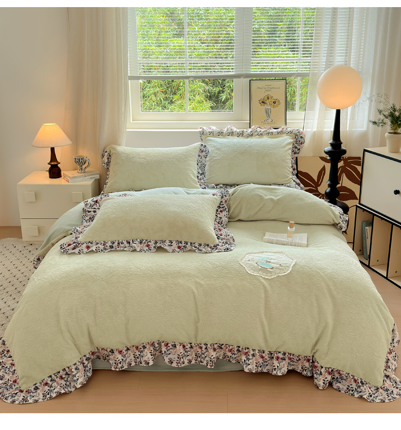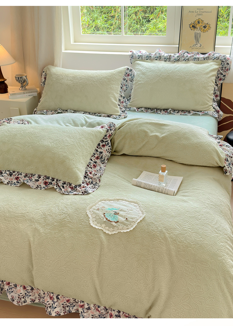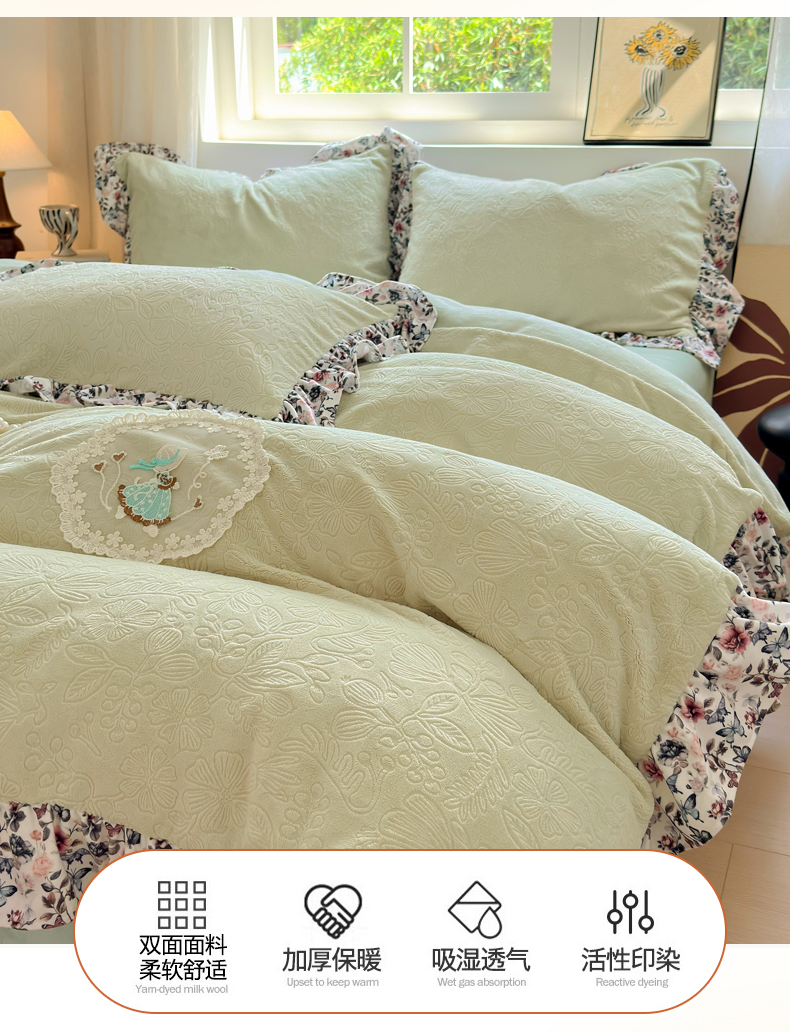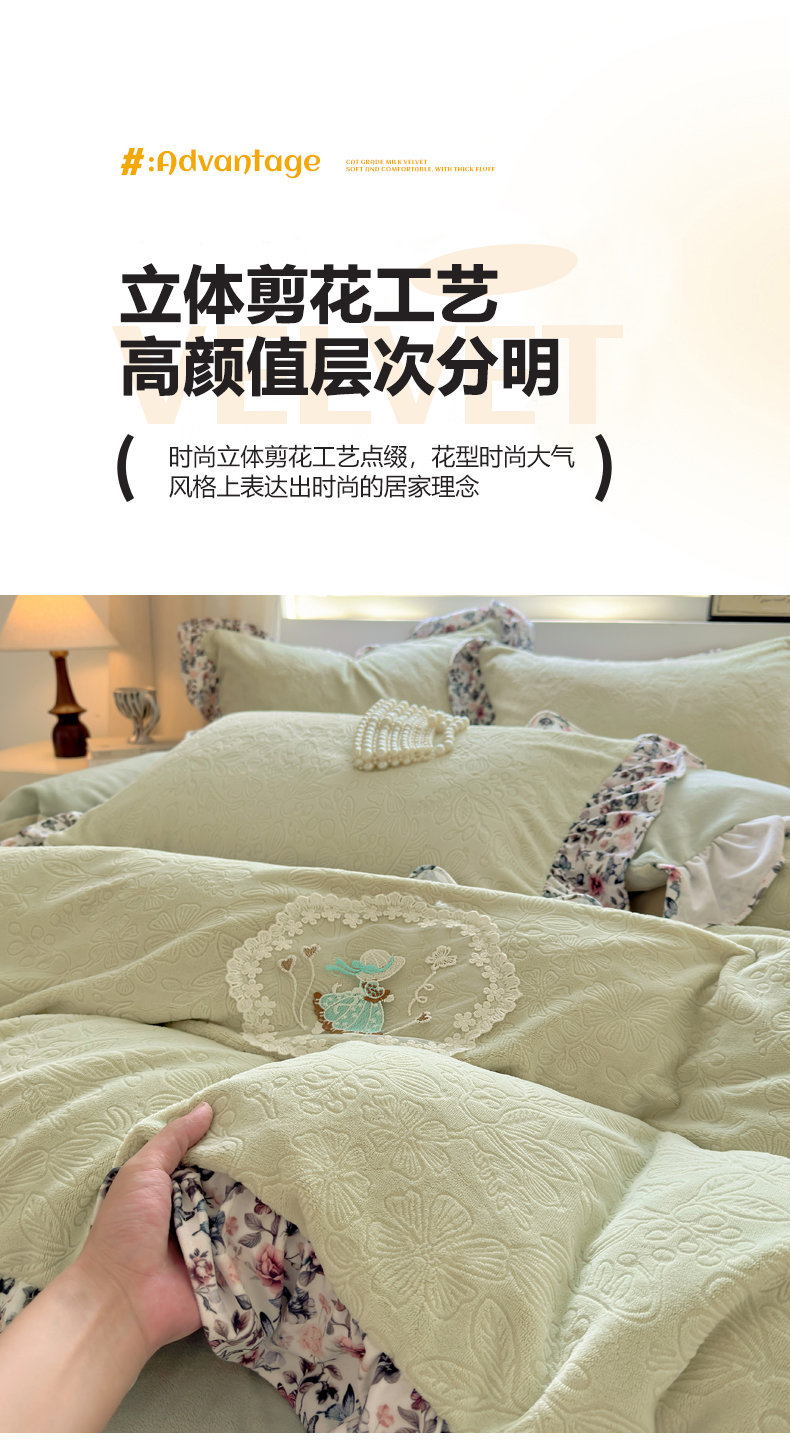 当前位置: 91家纺网 > 商品网购 > 床品套件 > 四件套 > 牛奶绒四件套 > 乐居家纺 2025新款蝴蝶花边款剪花提花牛奶绒四件套(含买家秀和质检报告) 蝴蝶花边款-盛夏-绿