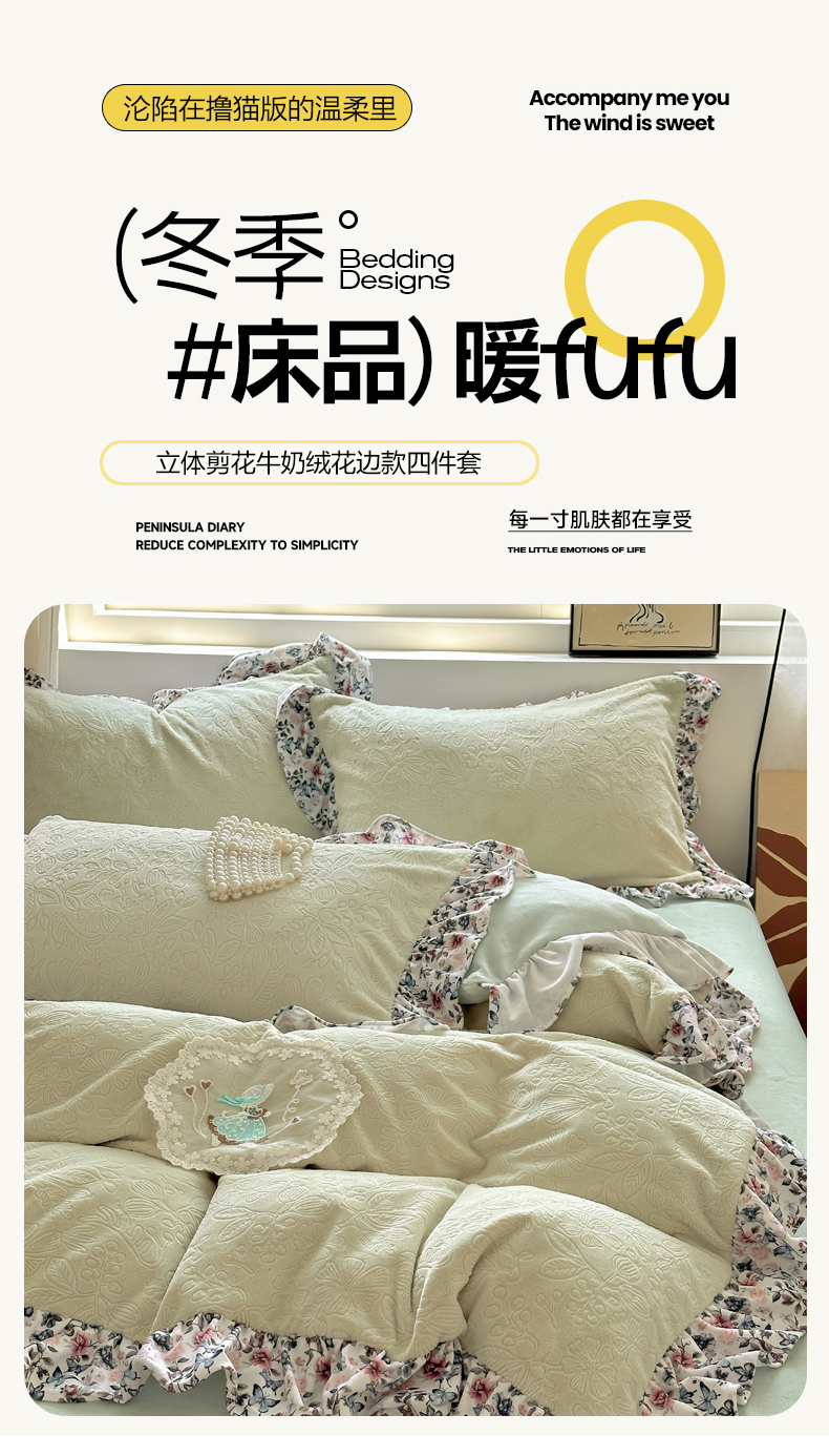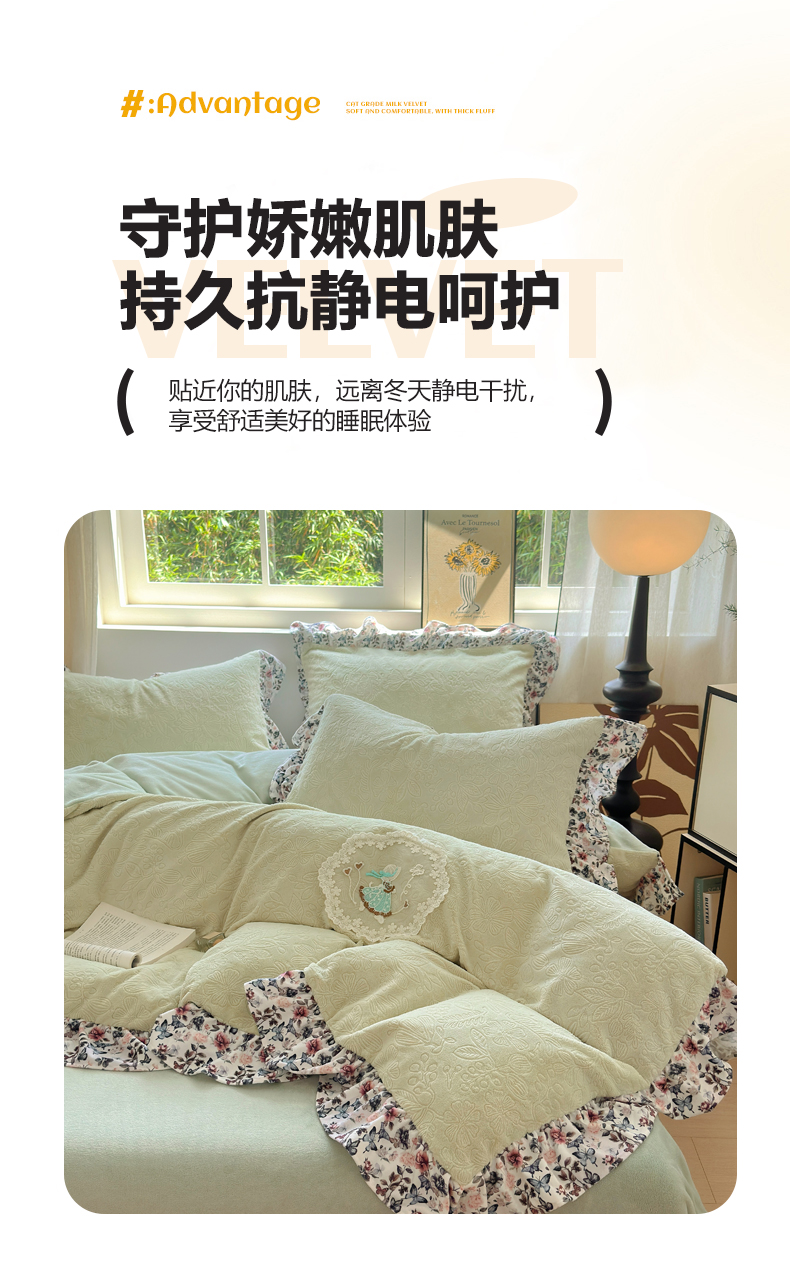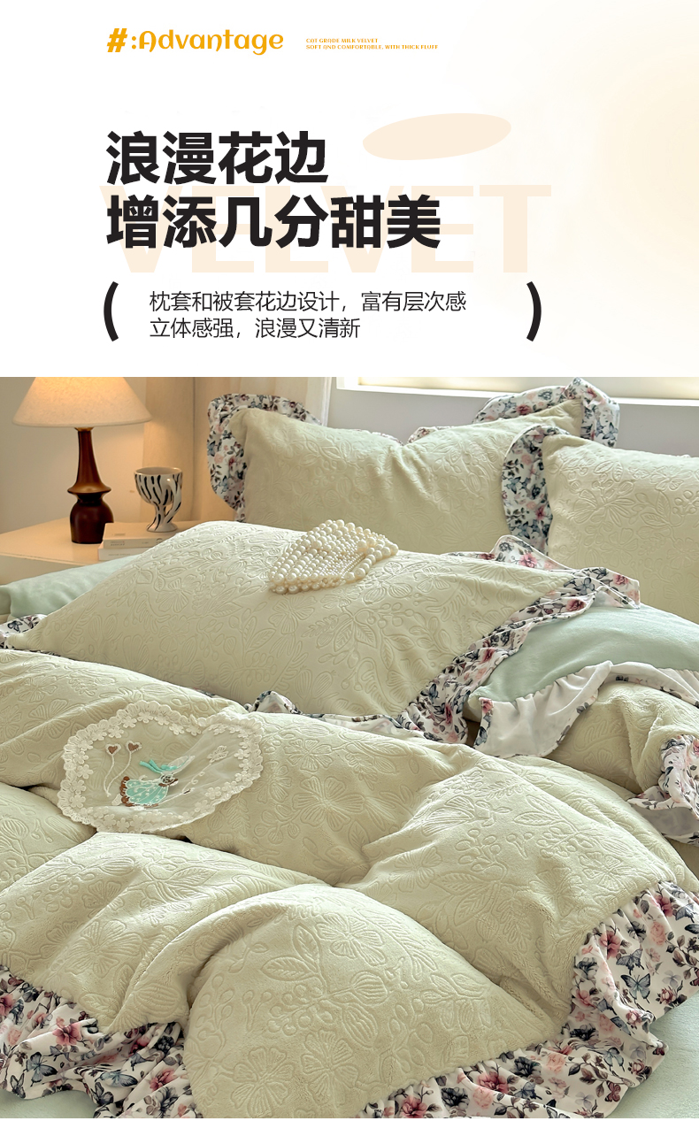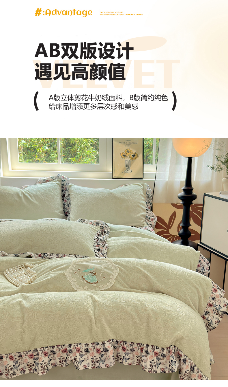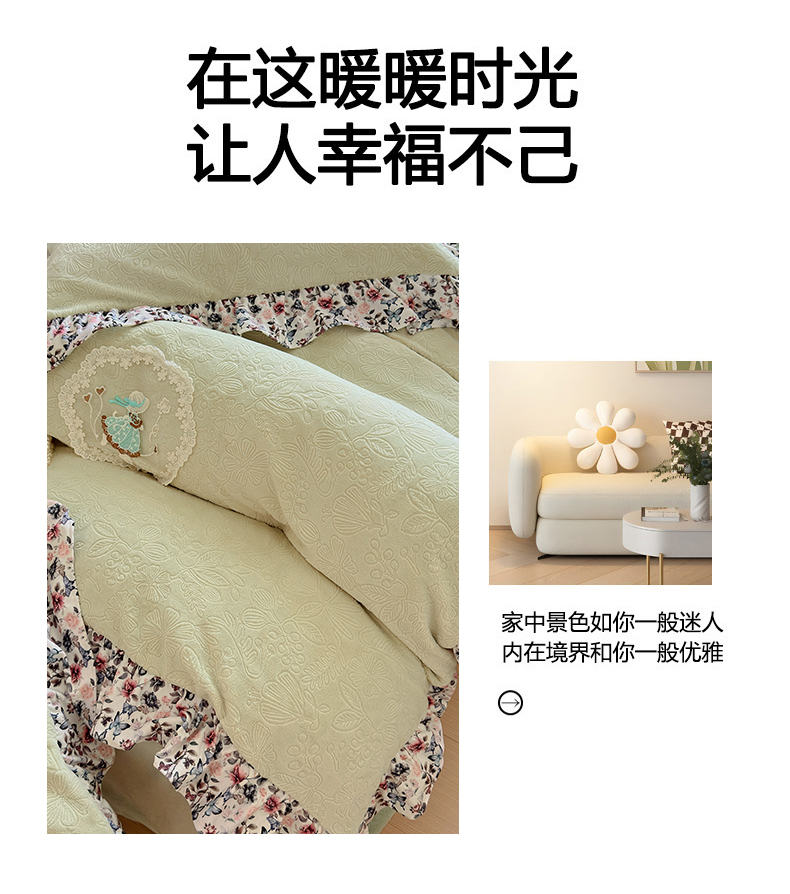 当前位置: 91家纺网 > 商品网购 > 床品套件 > 四件套 > 牛奶绒四件套 > 乐居家纺 2025新款蝴蝶花边款剪花提花牛奶绒四件套(含买家秀和质检报告) 蝴蝶花边款-盛夏-绿
