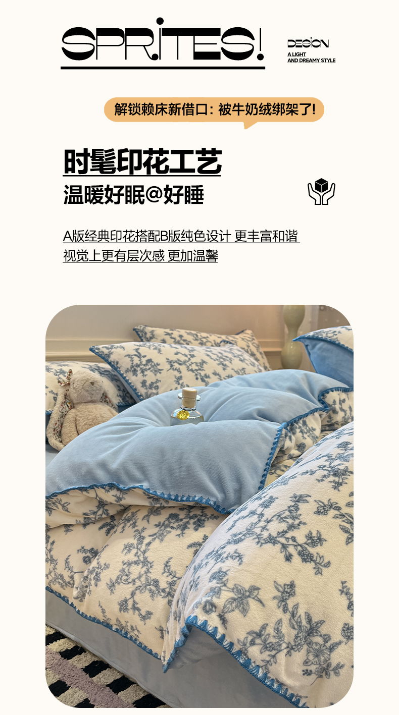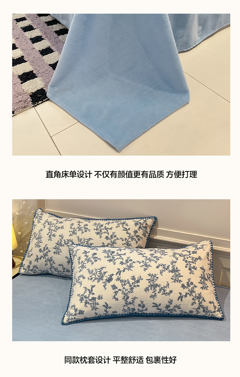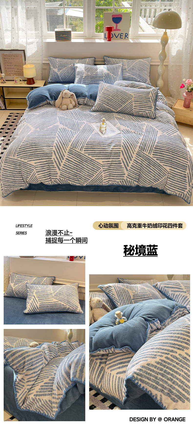商品名称:如一 2025新款A类高克重牛奶绒印花三角针工艺四件套 雅韵蓝
