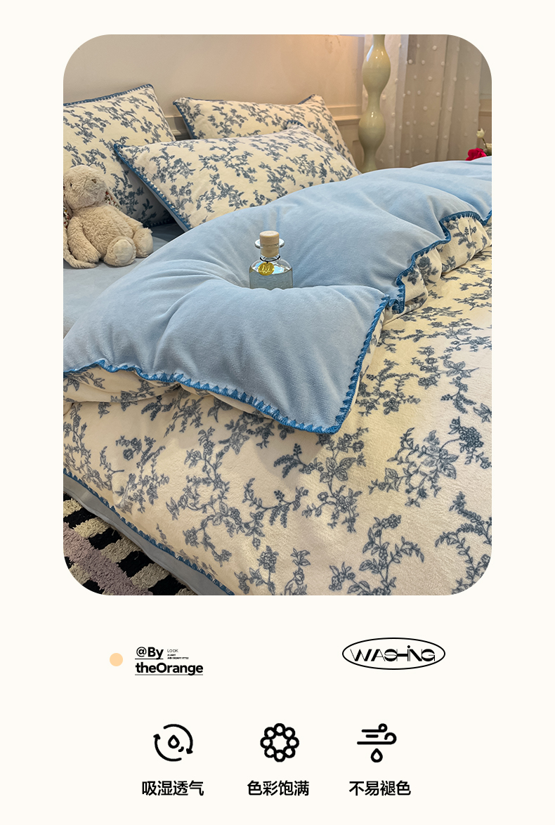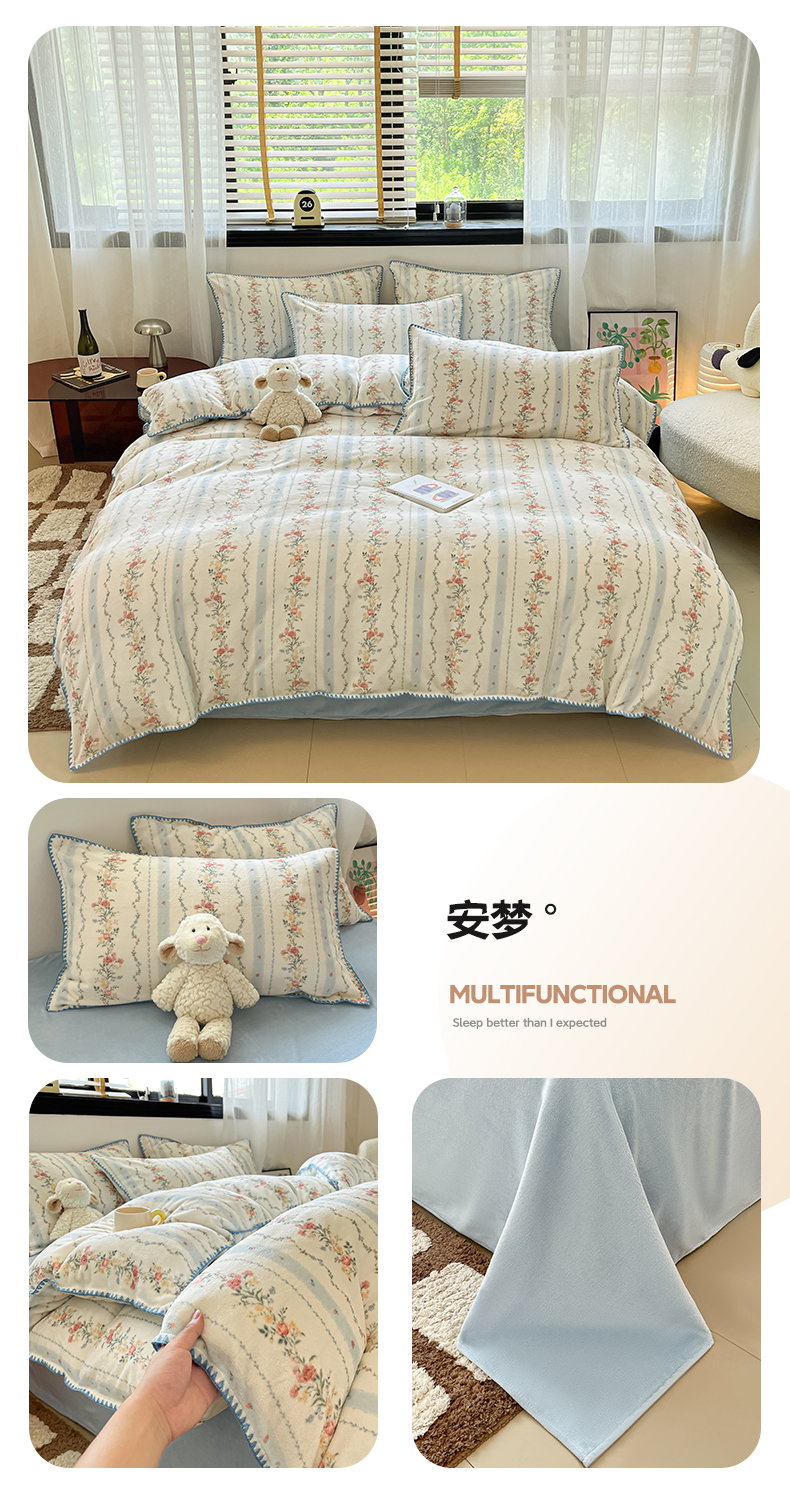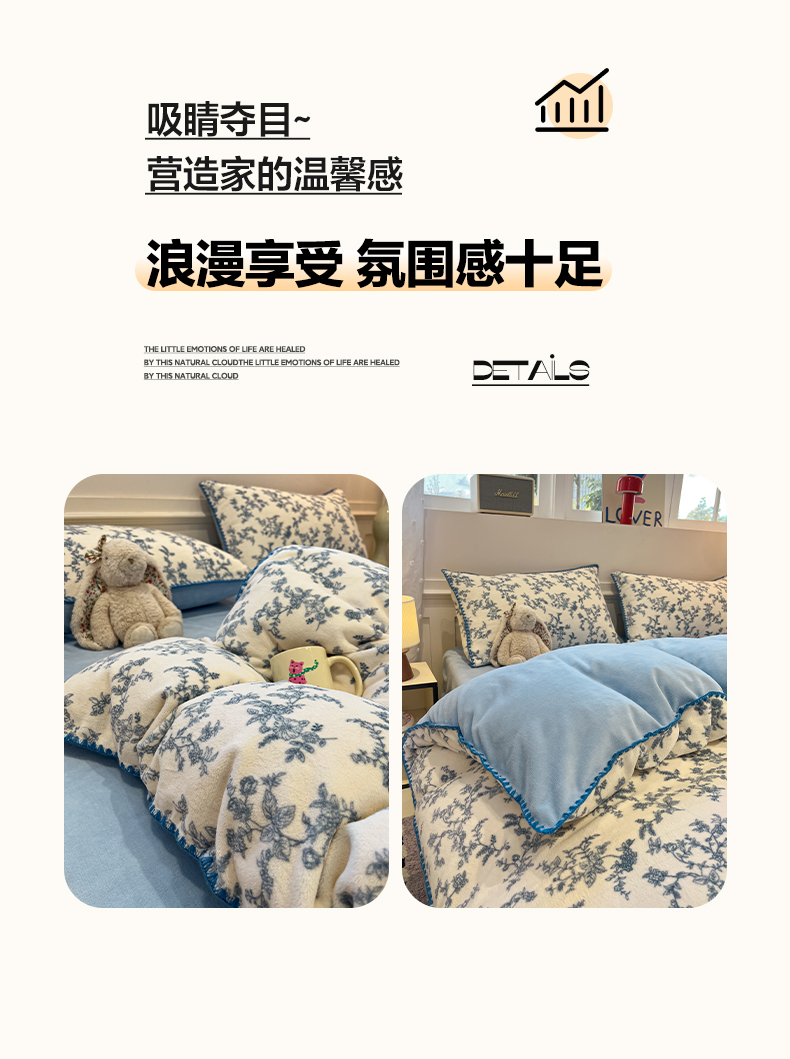 商品名称:如一 2025新款A类高克重牛奶绒印花三角针工艺四件套 雅韵蓝