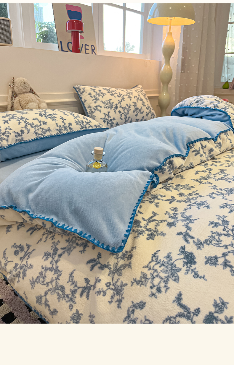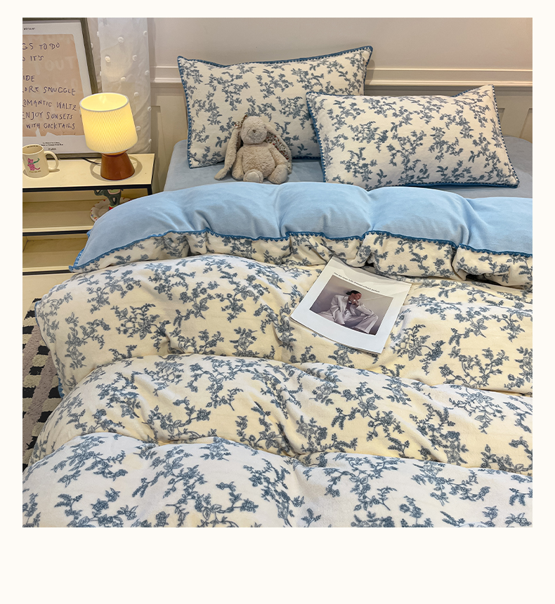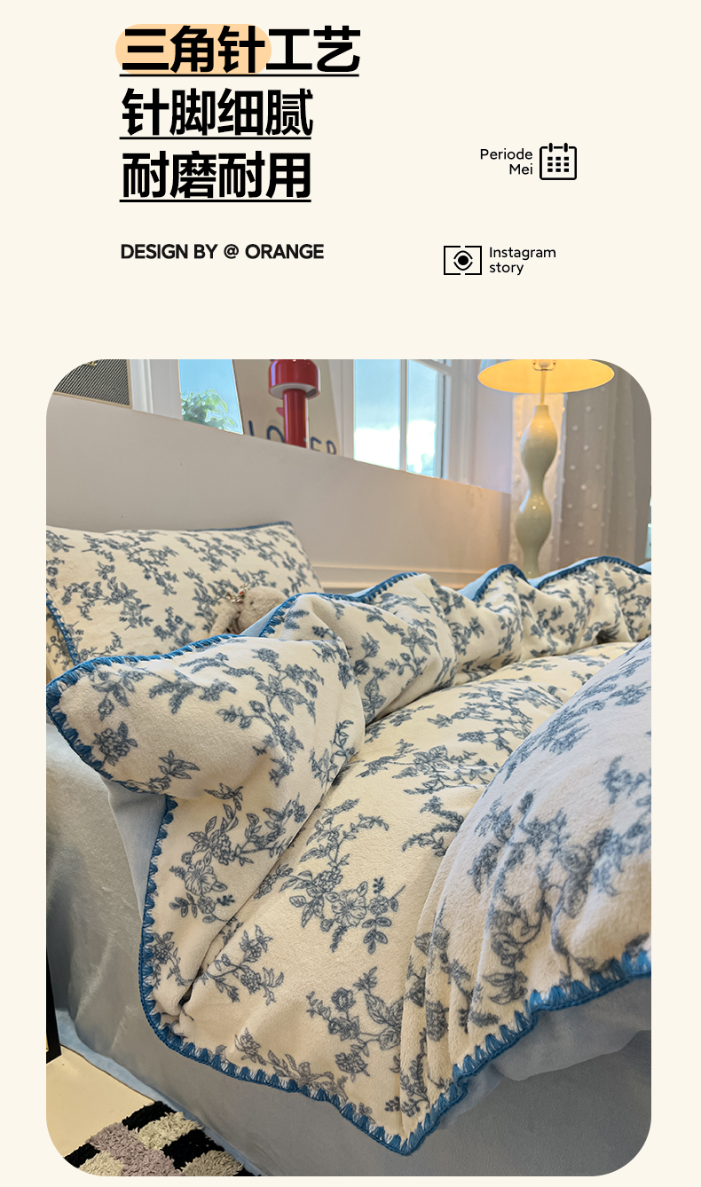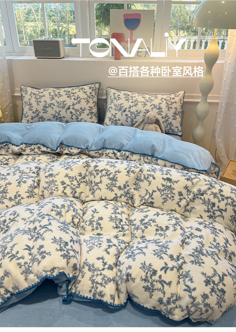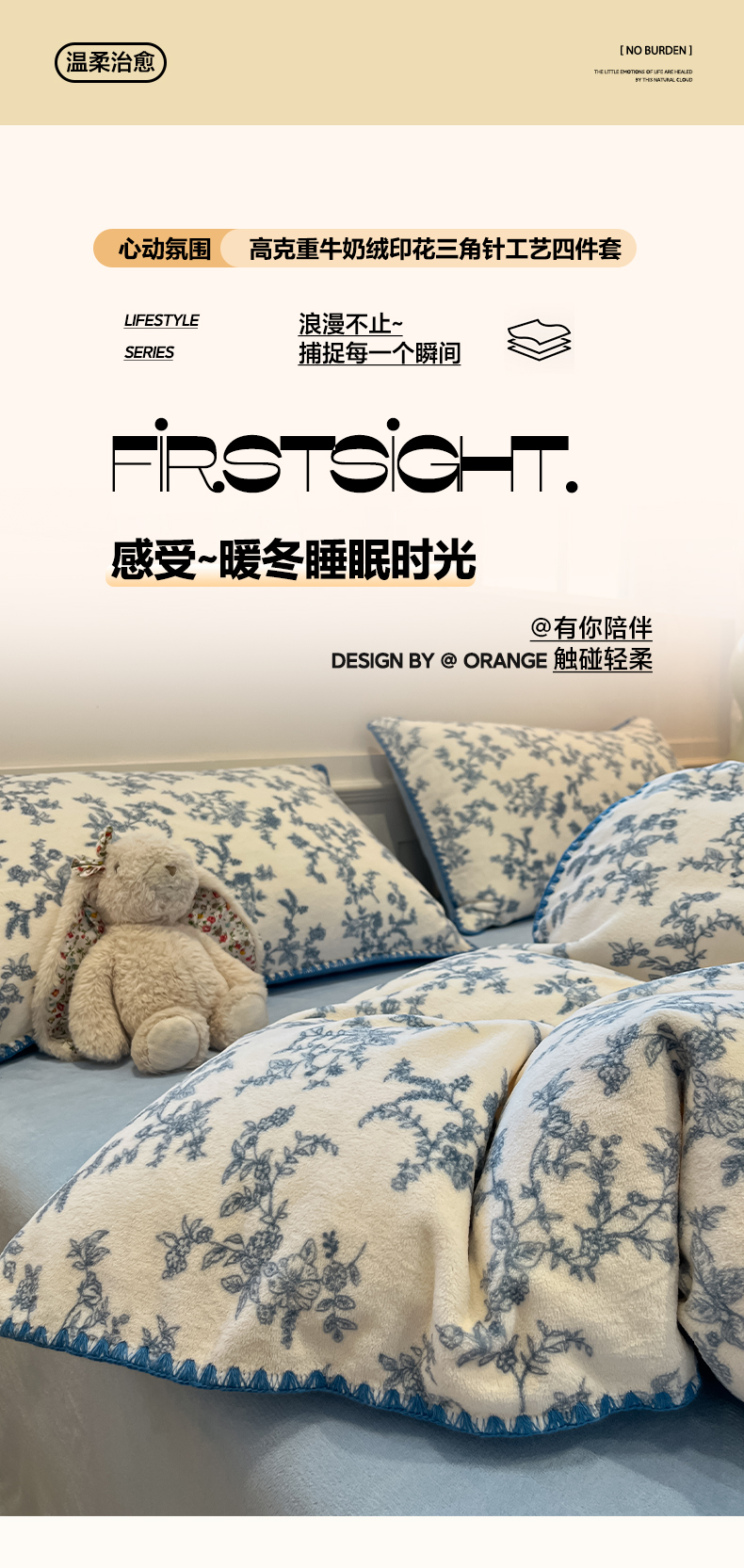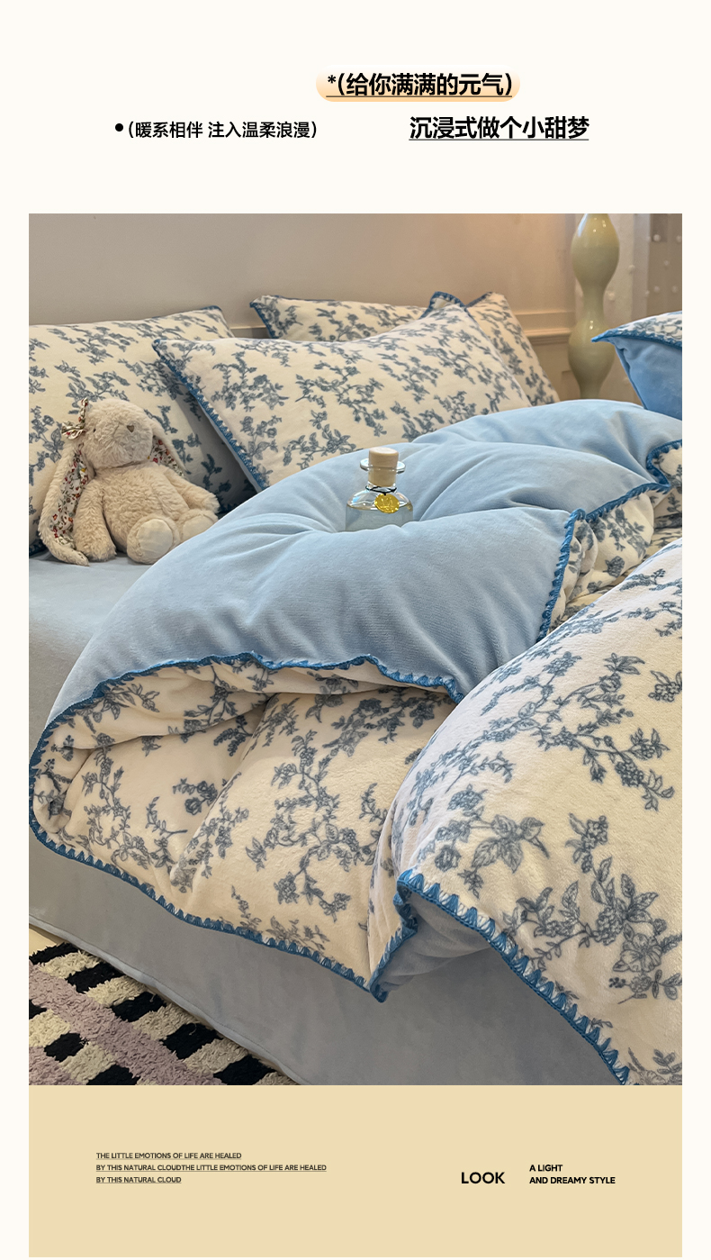 如一 2025新款A类高克重牛奶绒印花三角针工艺四件套 雅韵蓝