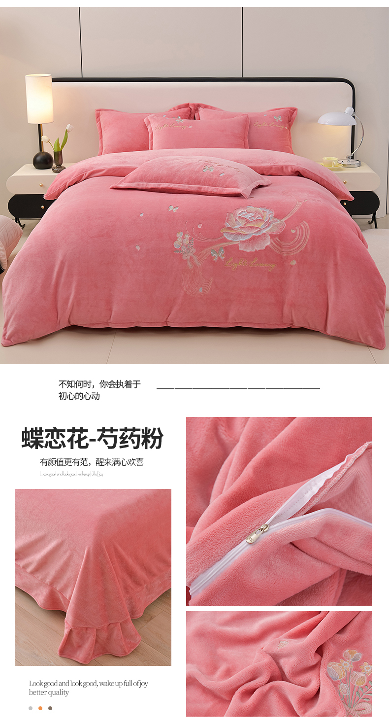 绒小宣 2025新款高克重牛奶绒刺绣四件套 蝶恋花粉,蝶恋花-粉