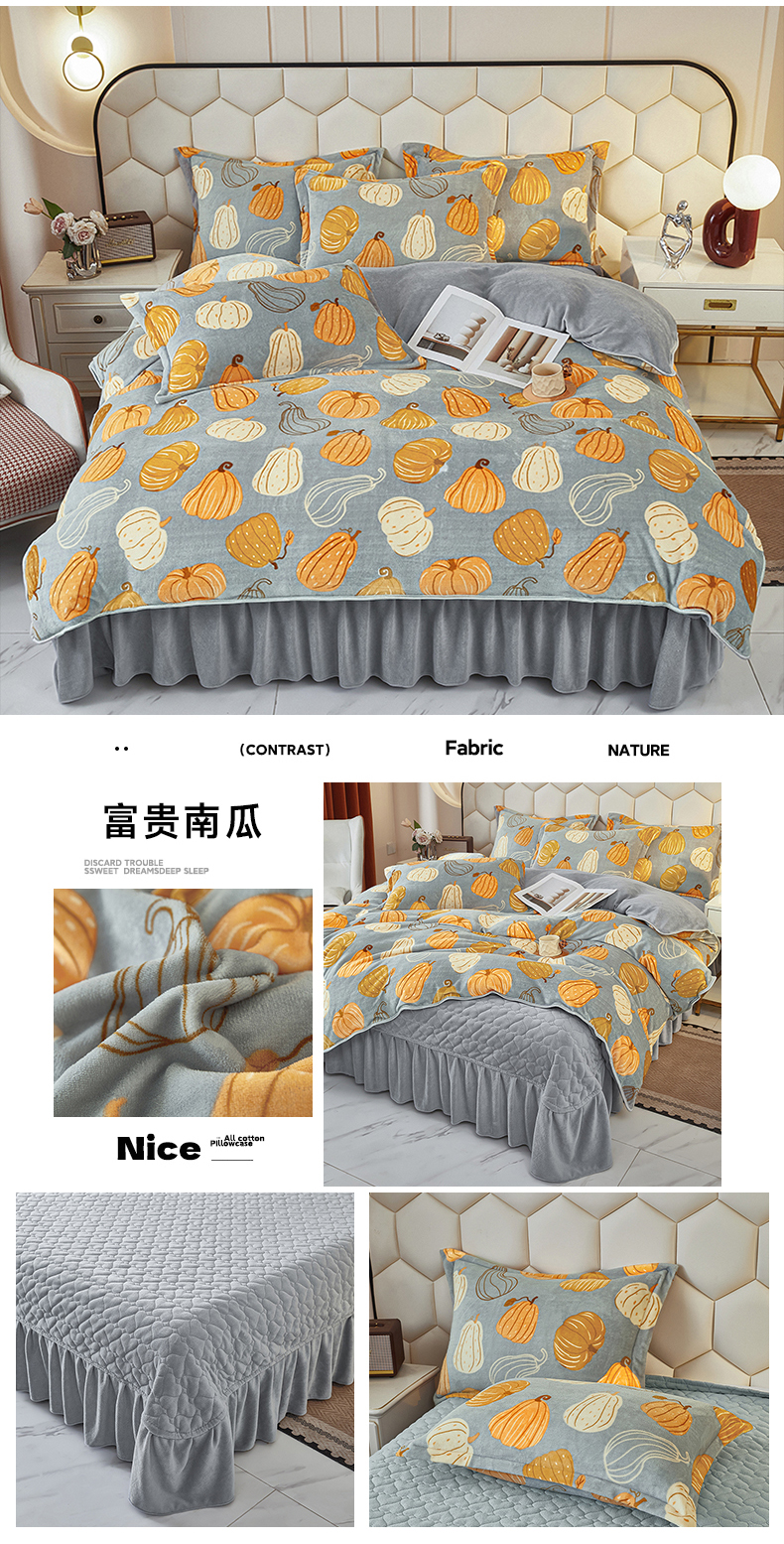商品名称:凤杰家纺 2025新款高克重210克牛奶绒床盖四件套 富贵南瓜