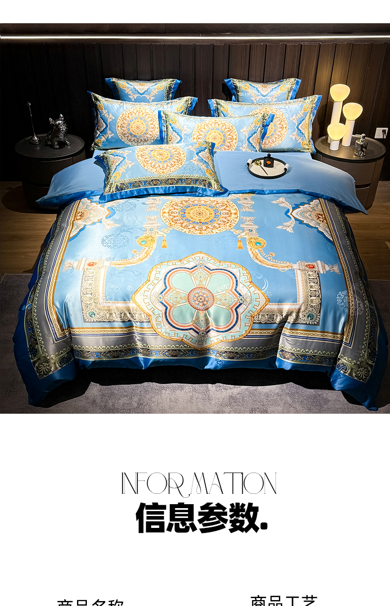 商品名称:七夜居 2025新款直播爆款欧式大阪轻奢贡缎提花加数码印花磨毛四件套 凯撒圣殿-帝王蓝