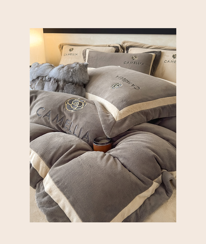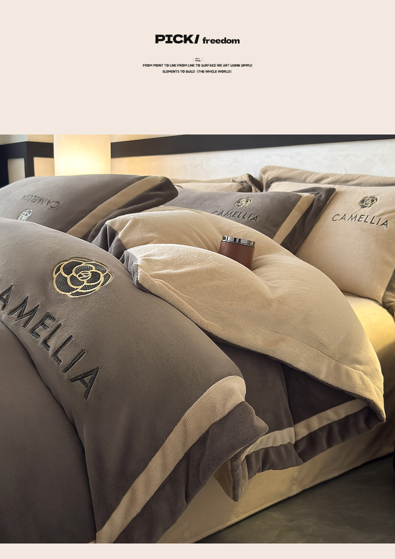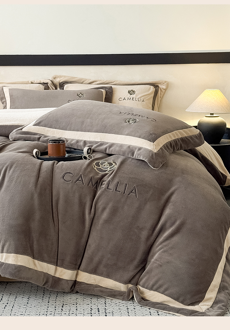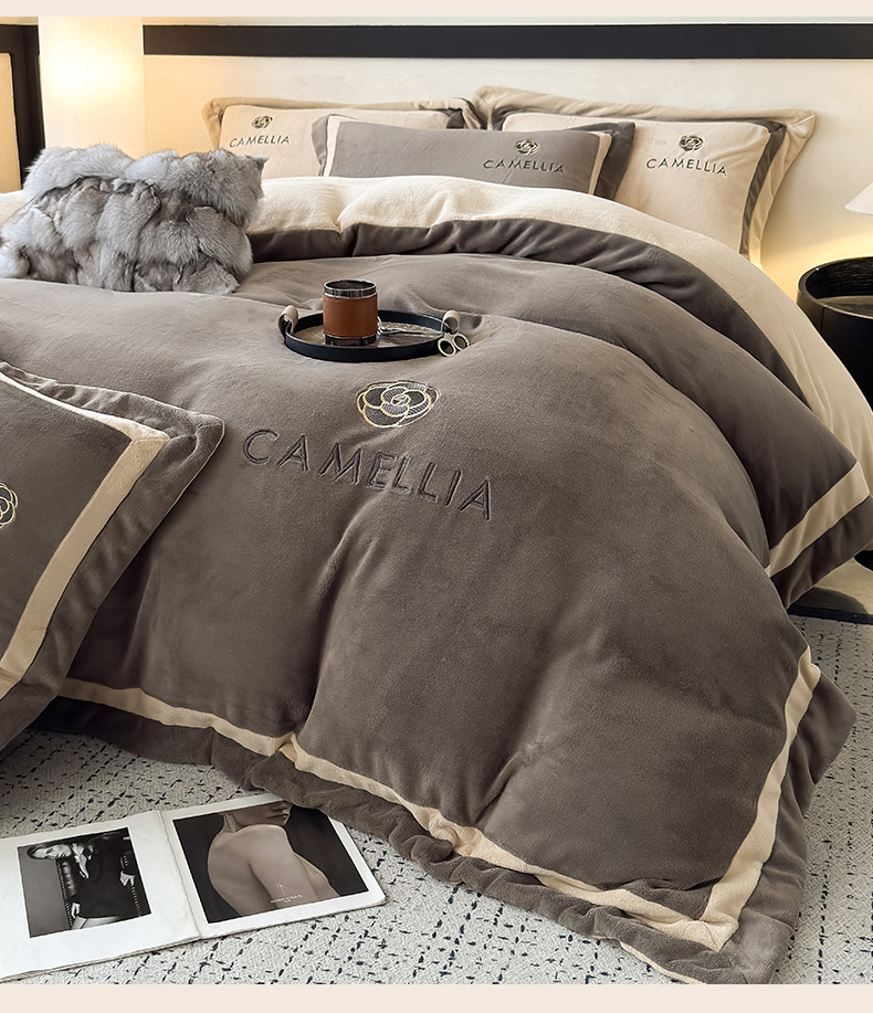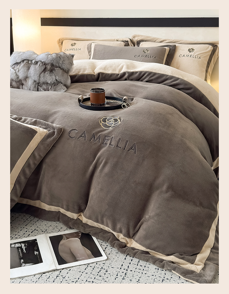 (总)水云缦 2025新款双拼角牛奶绒绣花四件套系列,浅灰-茶褐色,浅卡其-褐色,奶白-褐色,樱粉-茶褐色,褐色-浅卡其