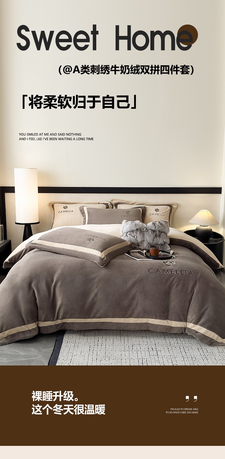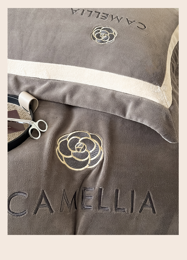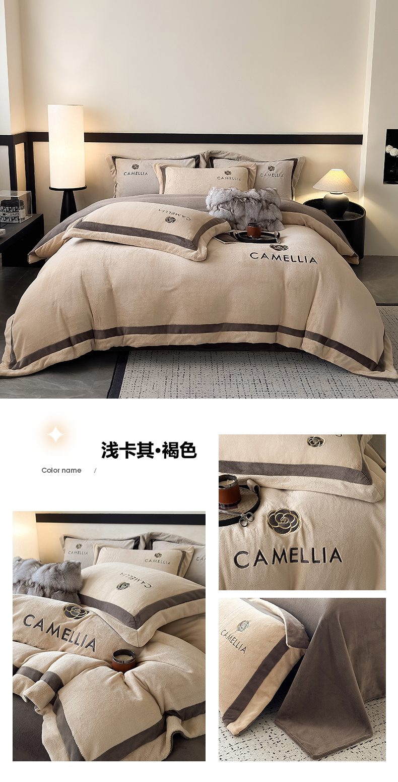 商品名称:水云缦 2025新款双拼角牛奶绒绣花四件套系列 褐色-浅卡其