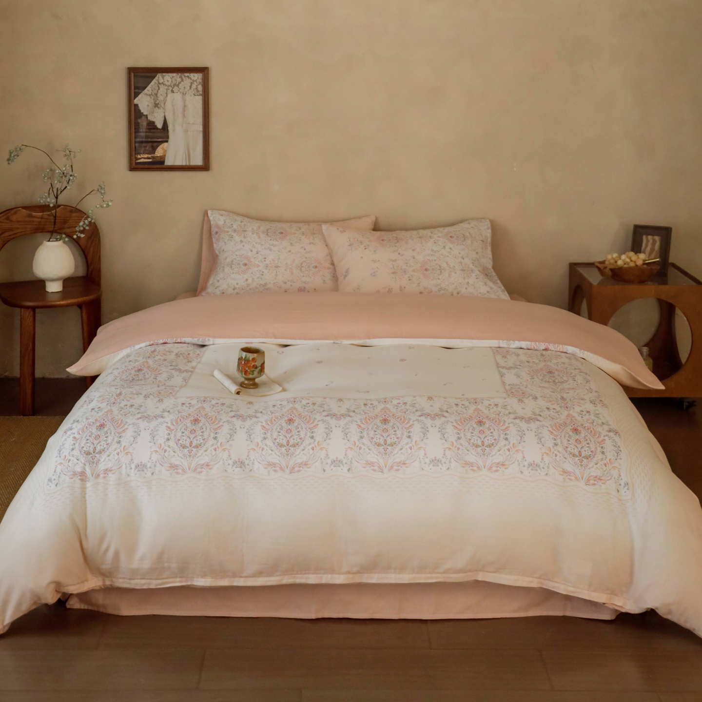 (总)窝米 2025新款数码印花100支长绒棉纯棉工艺花边款四件套-晚意,晚意