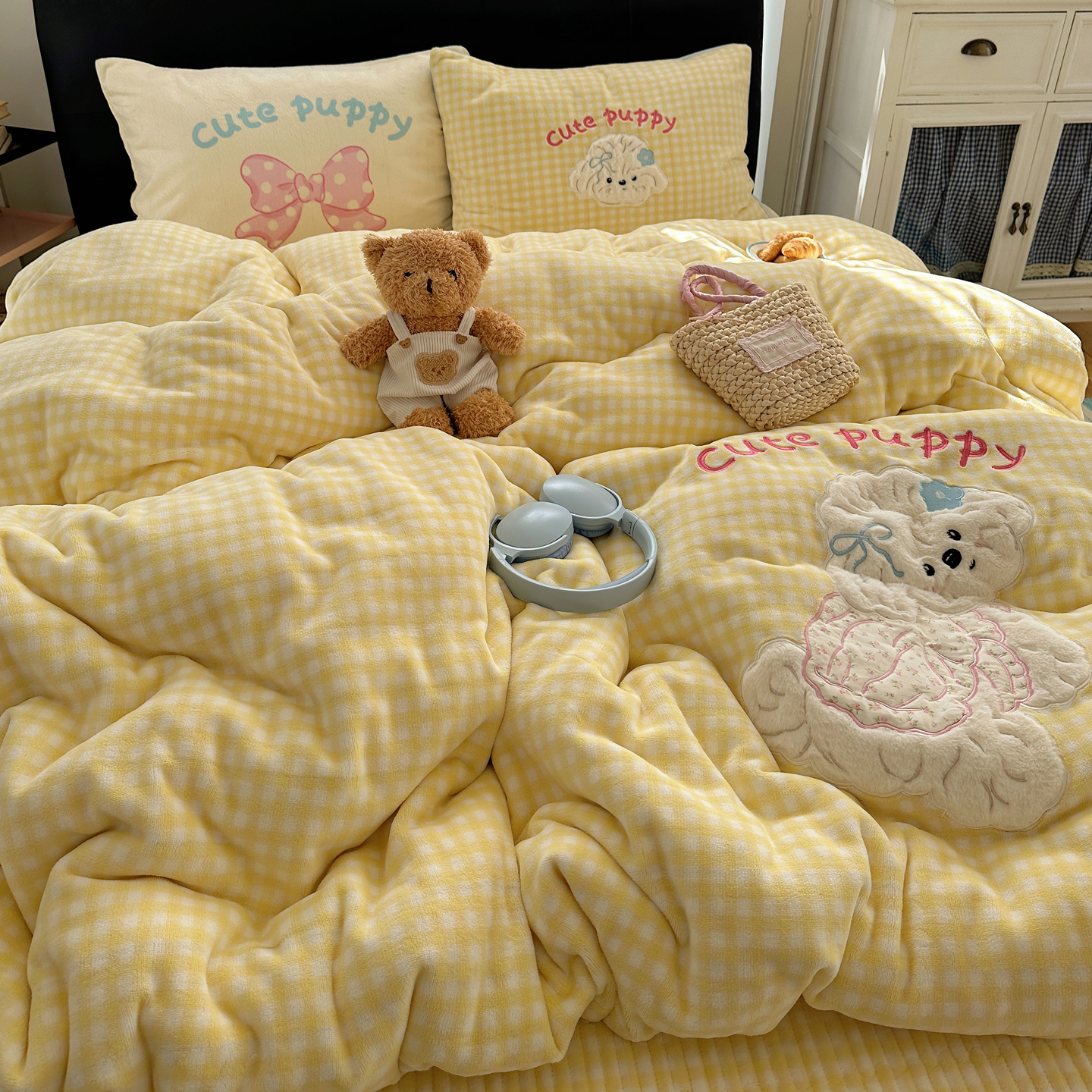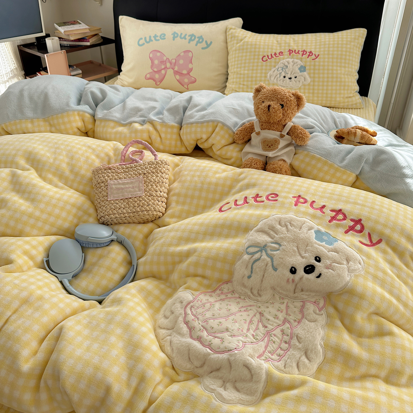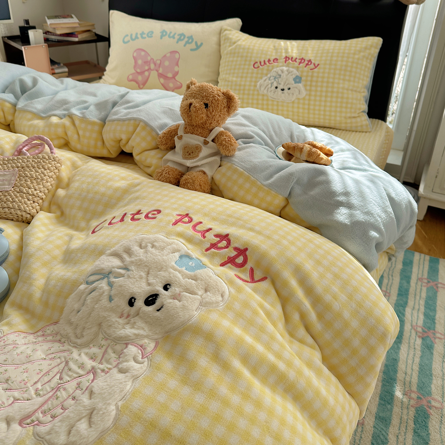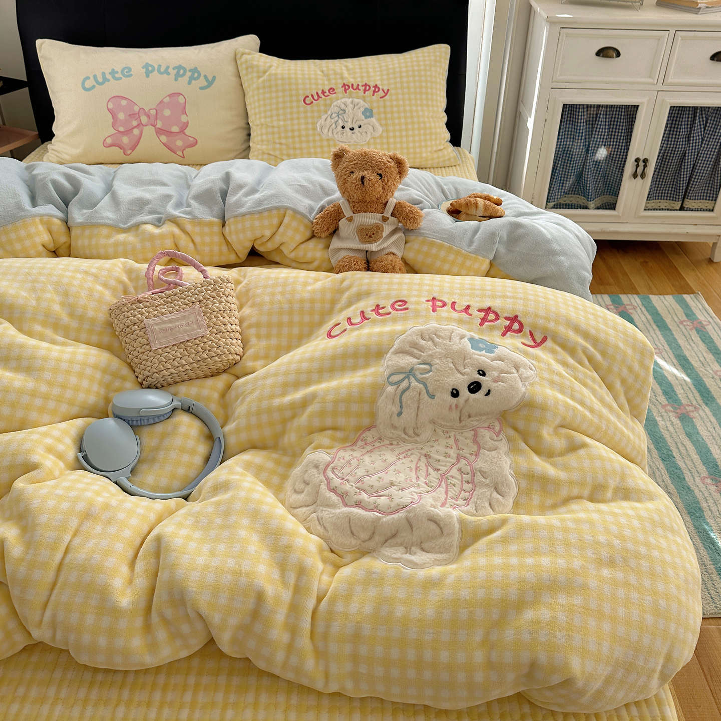 觅糖家纺 2025新款大版卡通牛奶绒床盖四件套 奶油小狗