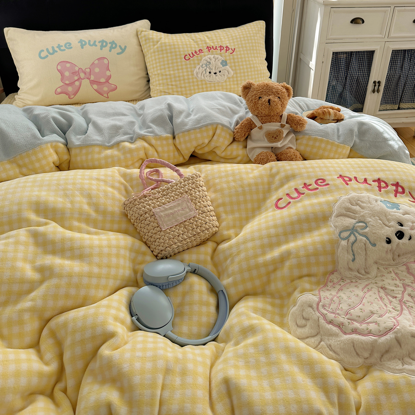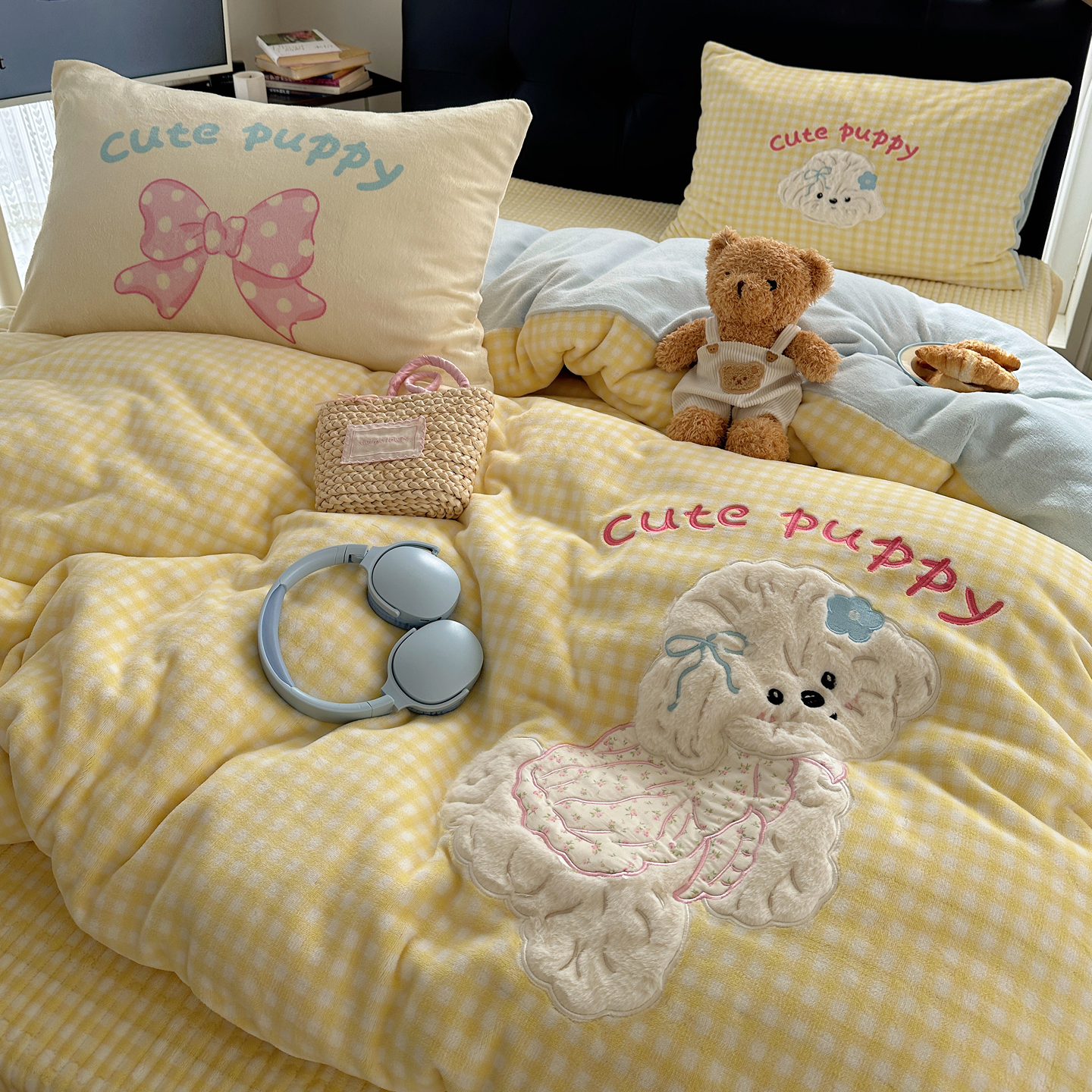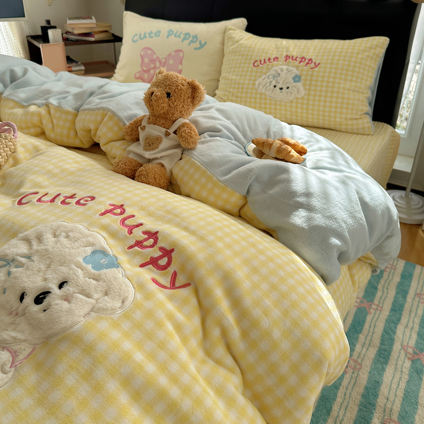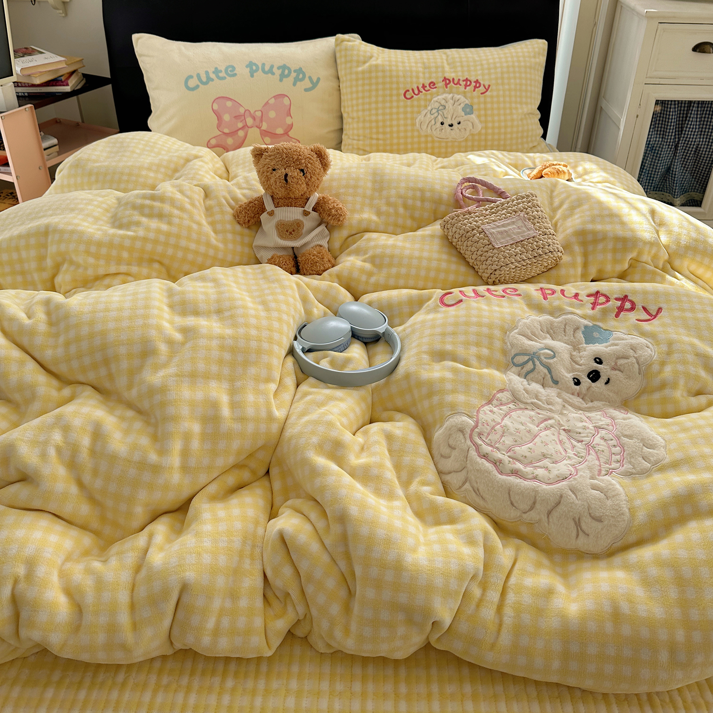 觅糖家纺 2025新款大版卡通牛奶绒床盖四件套 奶油小狗