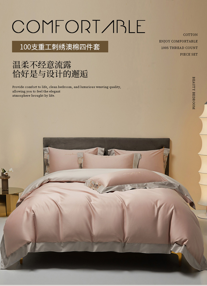 当前位置: 91家纺网 > 商品网购 > 床品套件 > 四件套 > 长绒棉四件套 > 咏绒家纺工厂店 2025新款100支澳棉纯棉CR工艺极简轻奢刺绣四件套-极光系列 极光-白桃茶粉
