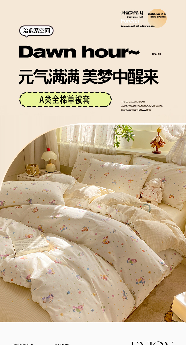 (总)红日子纺织品 2025新款A类全棉印花单被套,巴比龙,畅游花海,宠物陪伴,蝶舞,花宠乐章,花语萌兔,花园宝贝,可爱兔,玲语小狗,罗拉萌兔,洛可可,南瓜小狗,妮娜熊,沁雨花叶,韶华,甜心情节,香颂萌兔,和风曼舞,恋恋花语,绿意盎然,满园芬芳,曼波绿,泊影枫叶,悦色格调