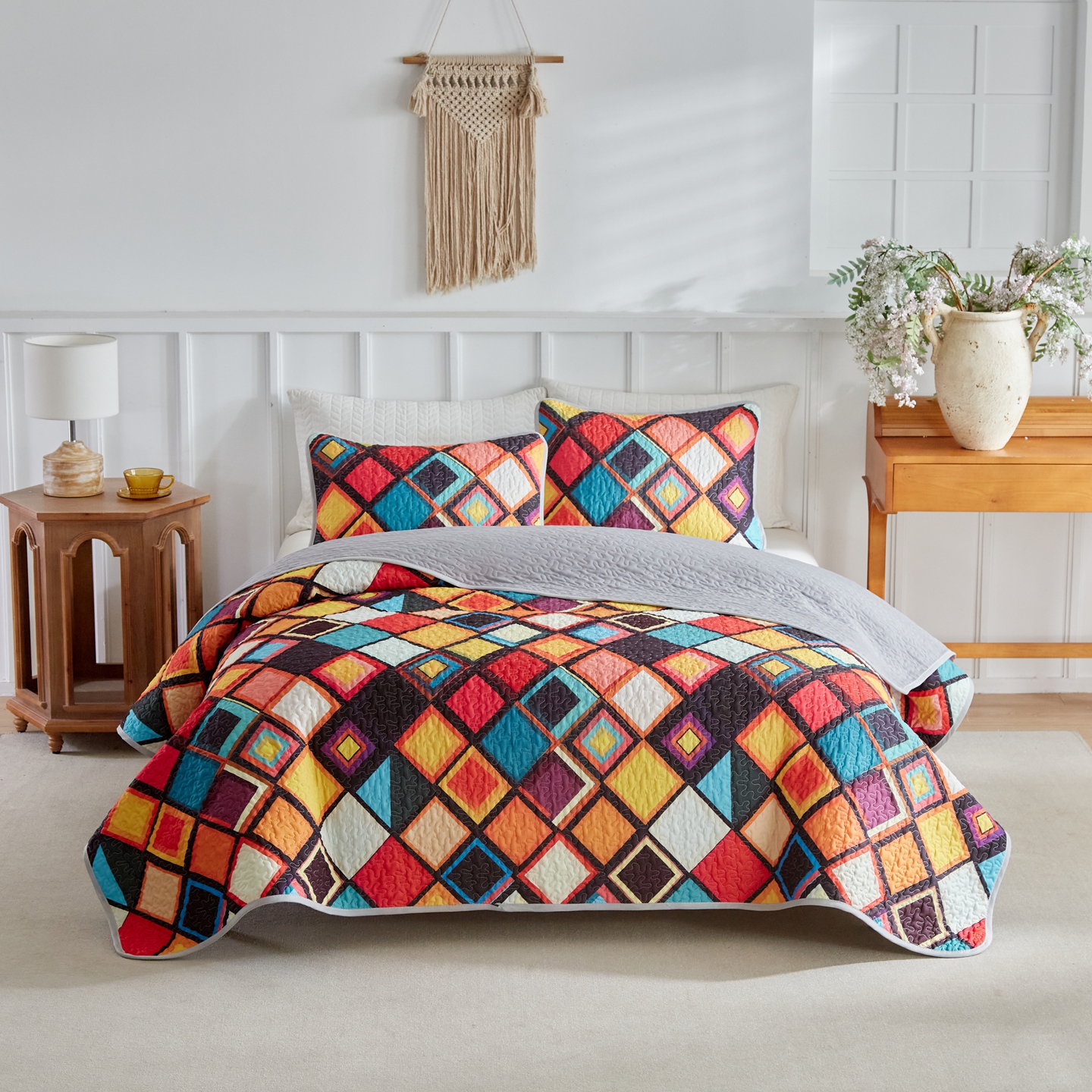 (总)温宁家纺 2025新款菱形格床盖三件套 国外薄被,菱形格-灰色,菱形格-绿色,菱形格-米色