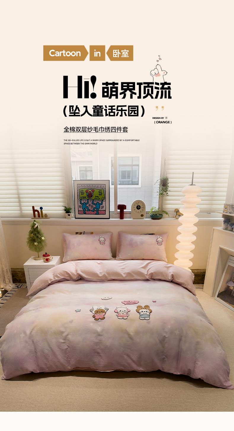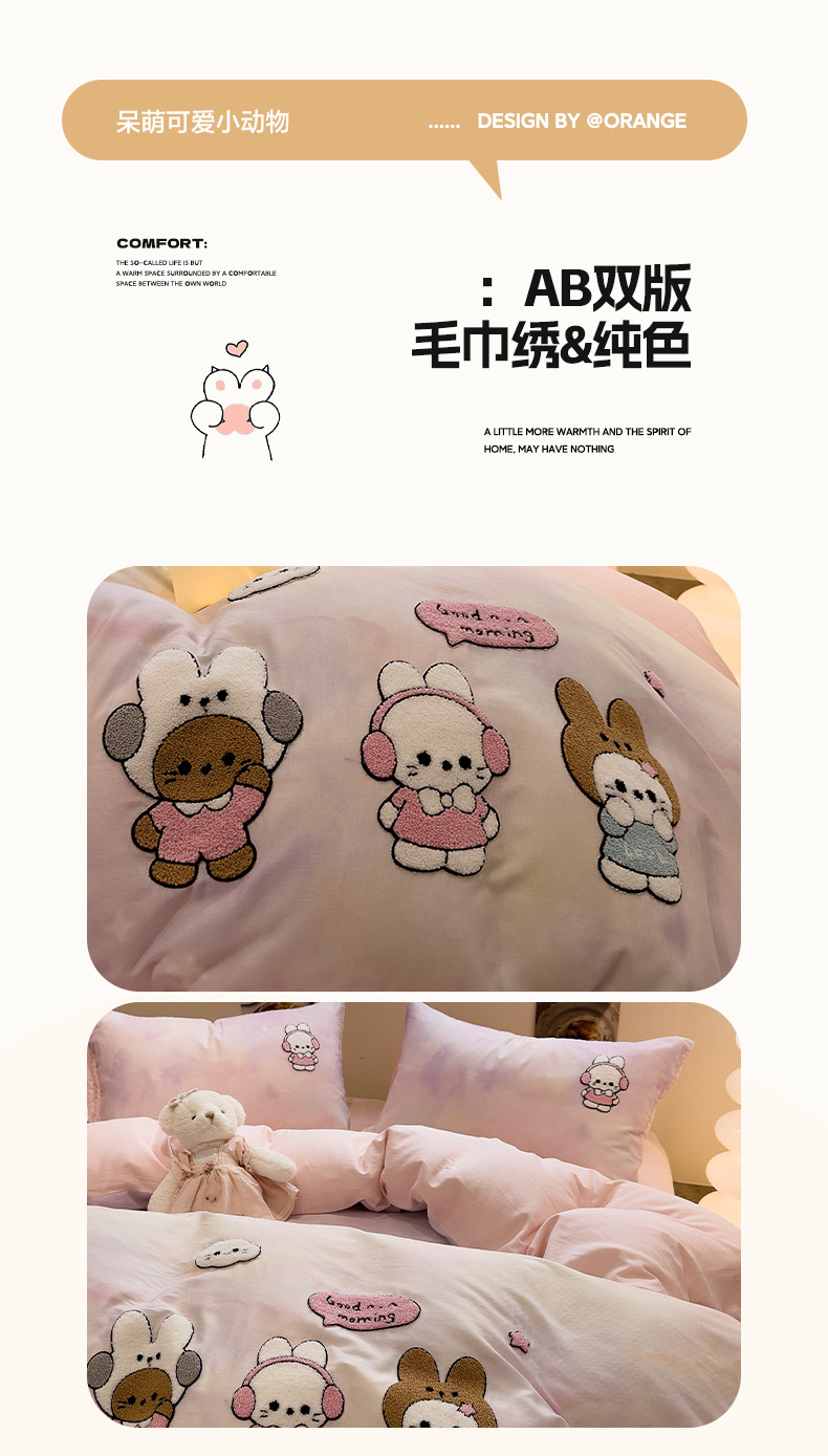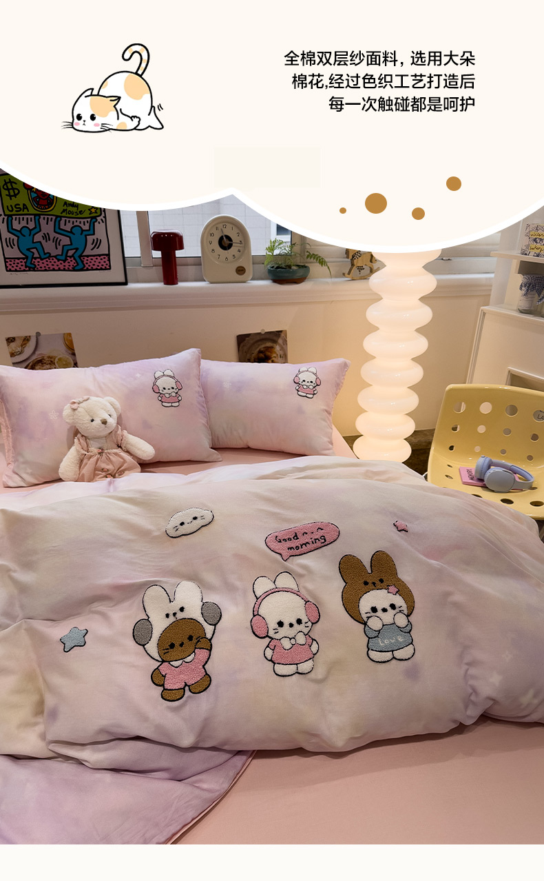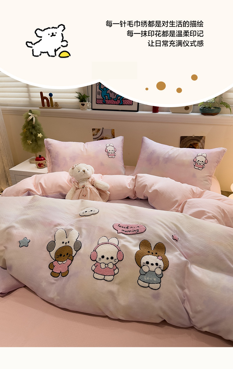 雅居纺家纺 2026新款全棉双层纱毛巾绣四件套 早安兔兔