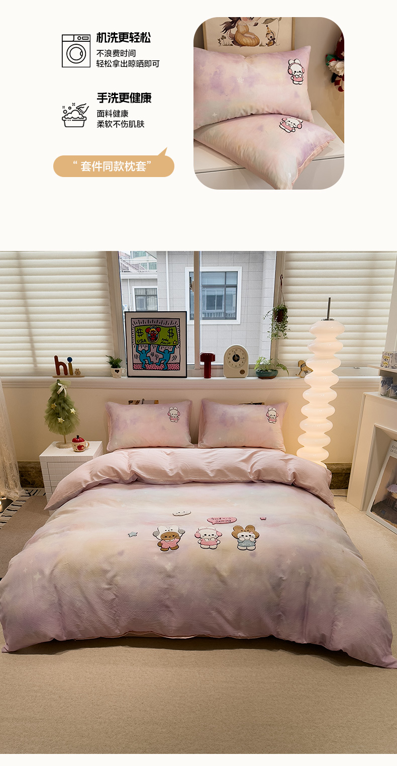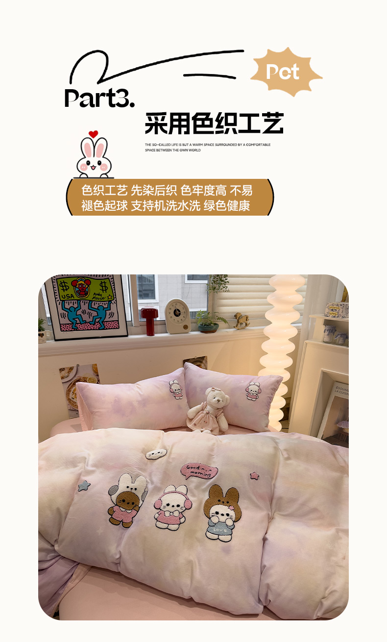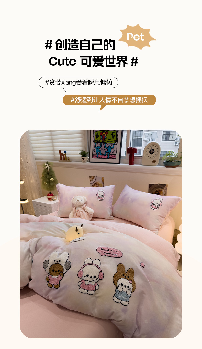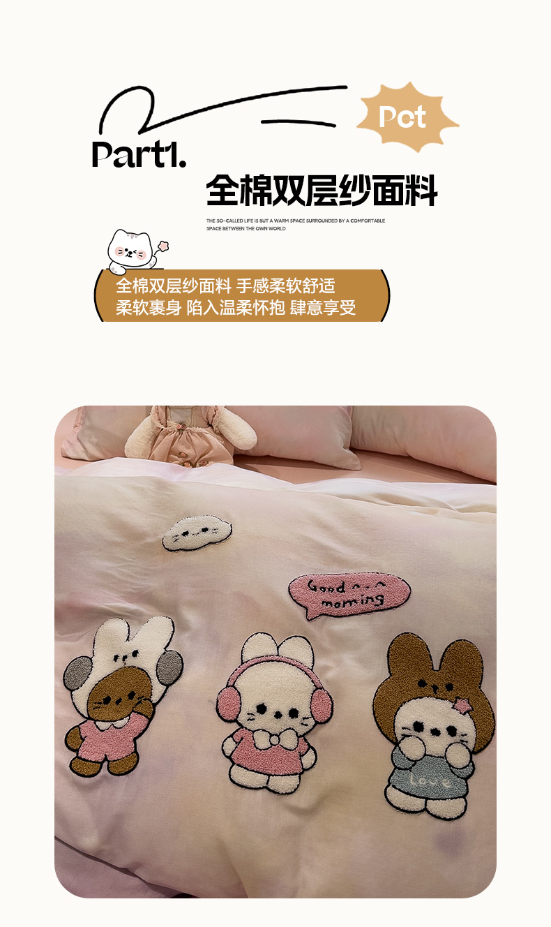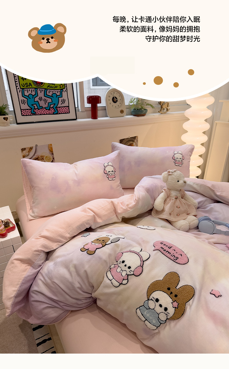 商品名称:雅居纺家纺 2026新款全棉双层纱毛巾绣四件套 早安兔兔