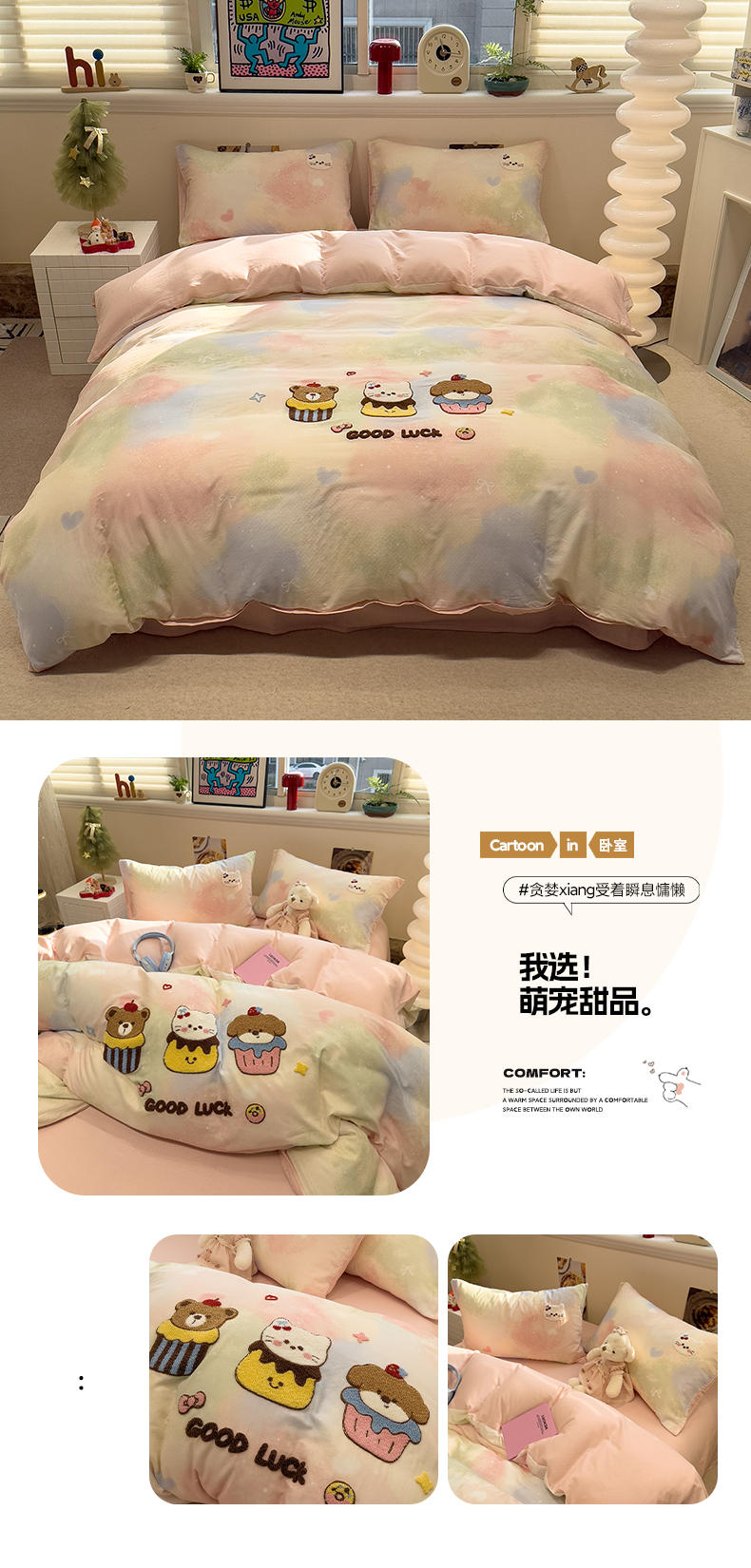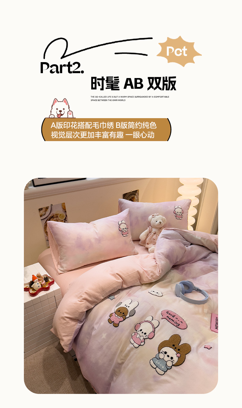 (总)雅居纺家纺 2026新款全棉双层纱毛巾绣四件套,蛋糕猫咪,红苹果小狗,萌宠甜品,早安兔兔