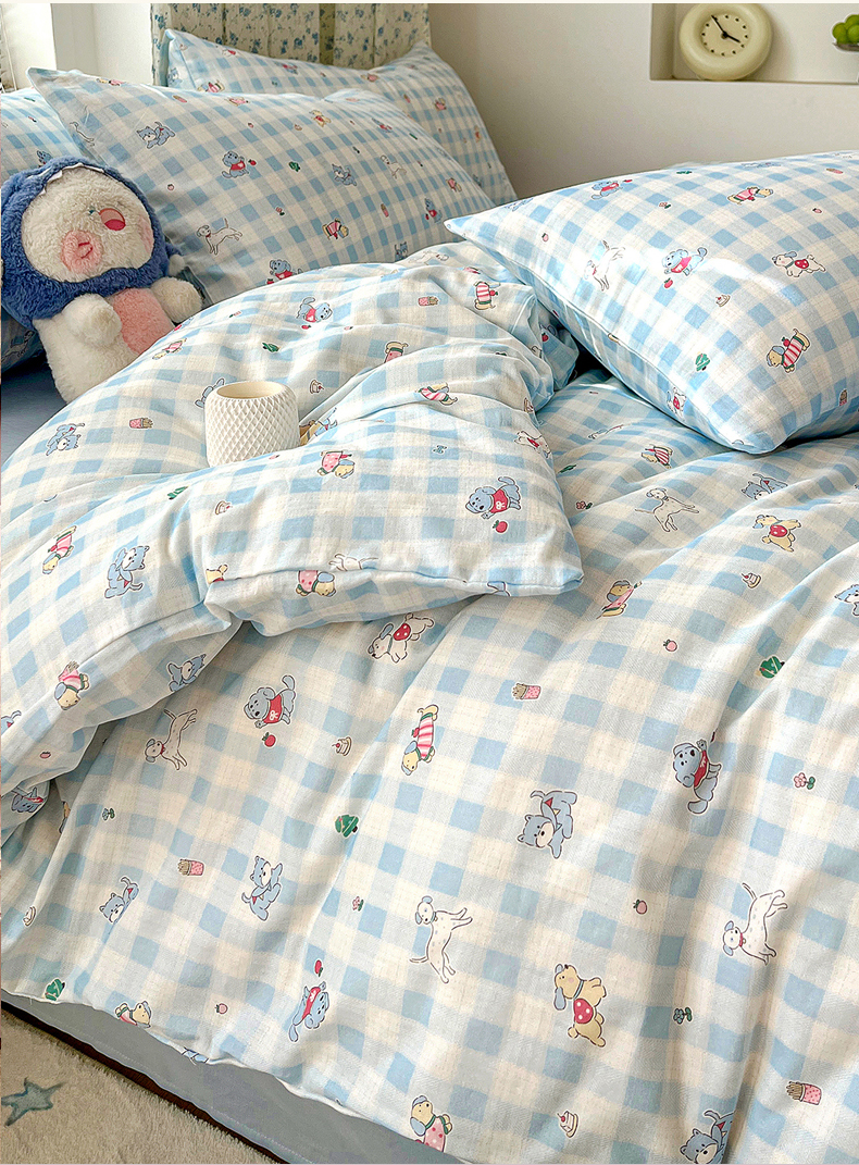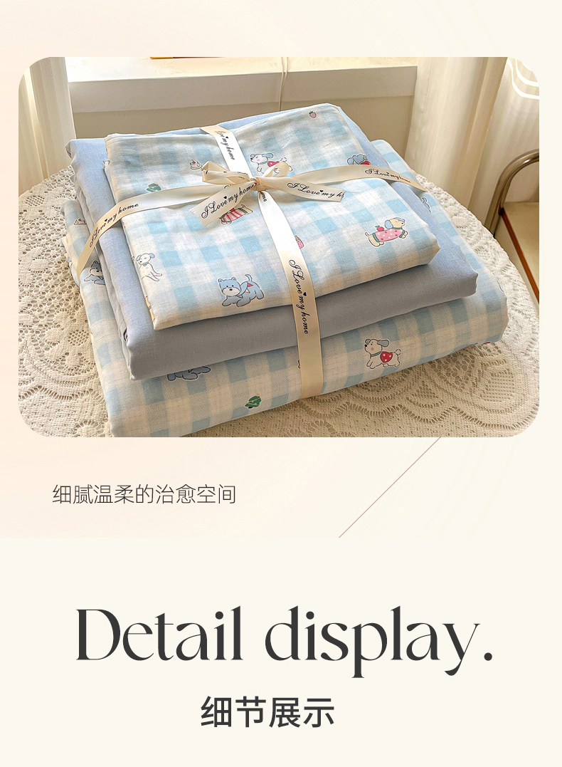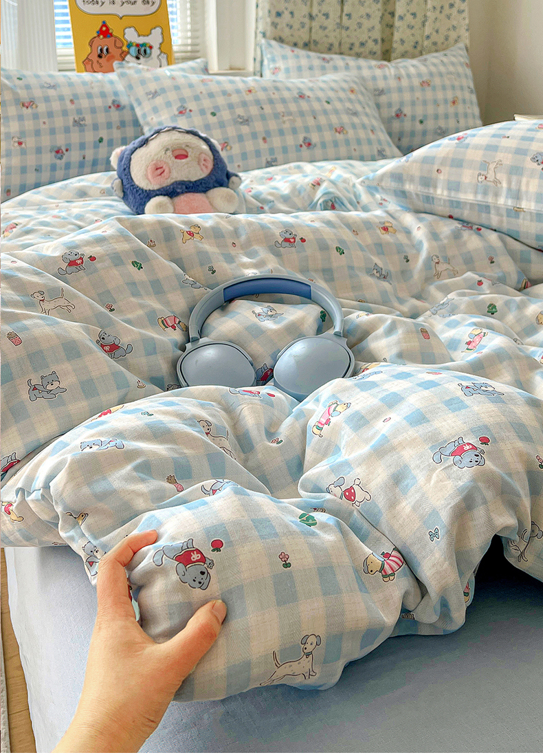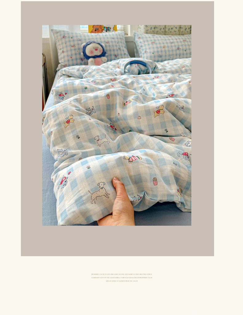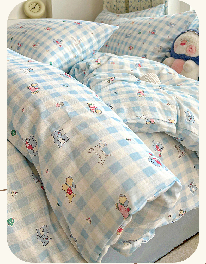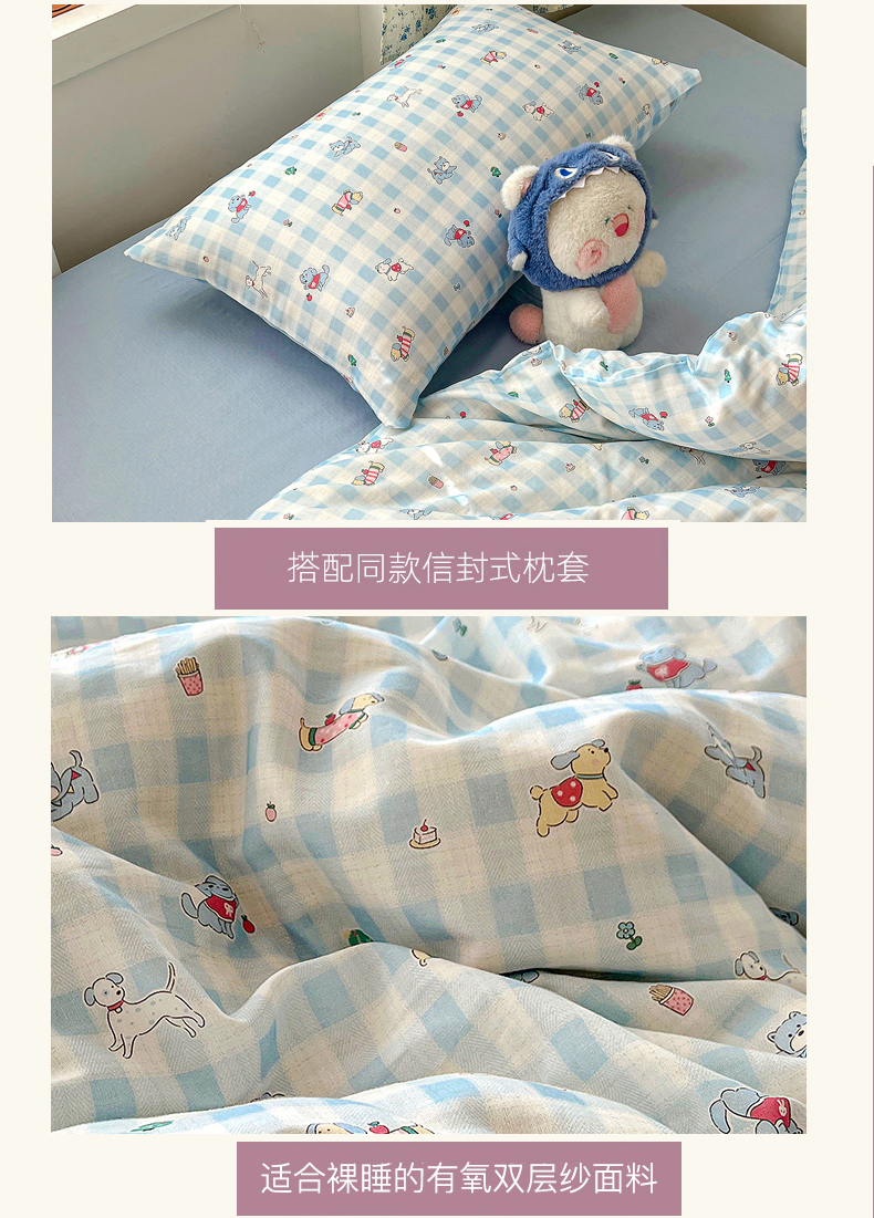 当前位置: 91家纺网 > 商品网购 > 床品套件 > 四件套 > 双层纱四件套 > 麦伦家居 2026春夏新品全棉有氧双层纱印花系列简约款四件套 格子狗狗蓝