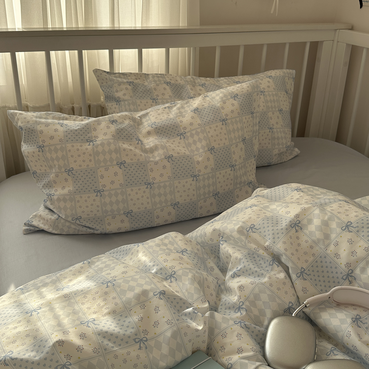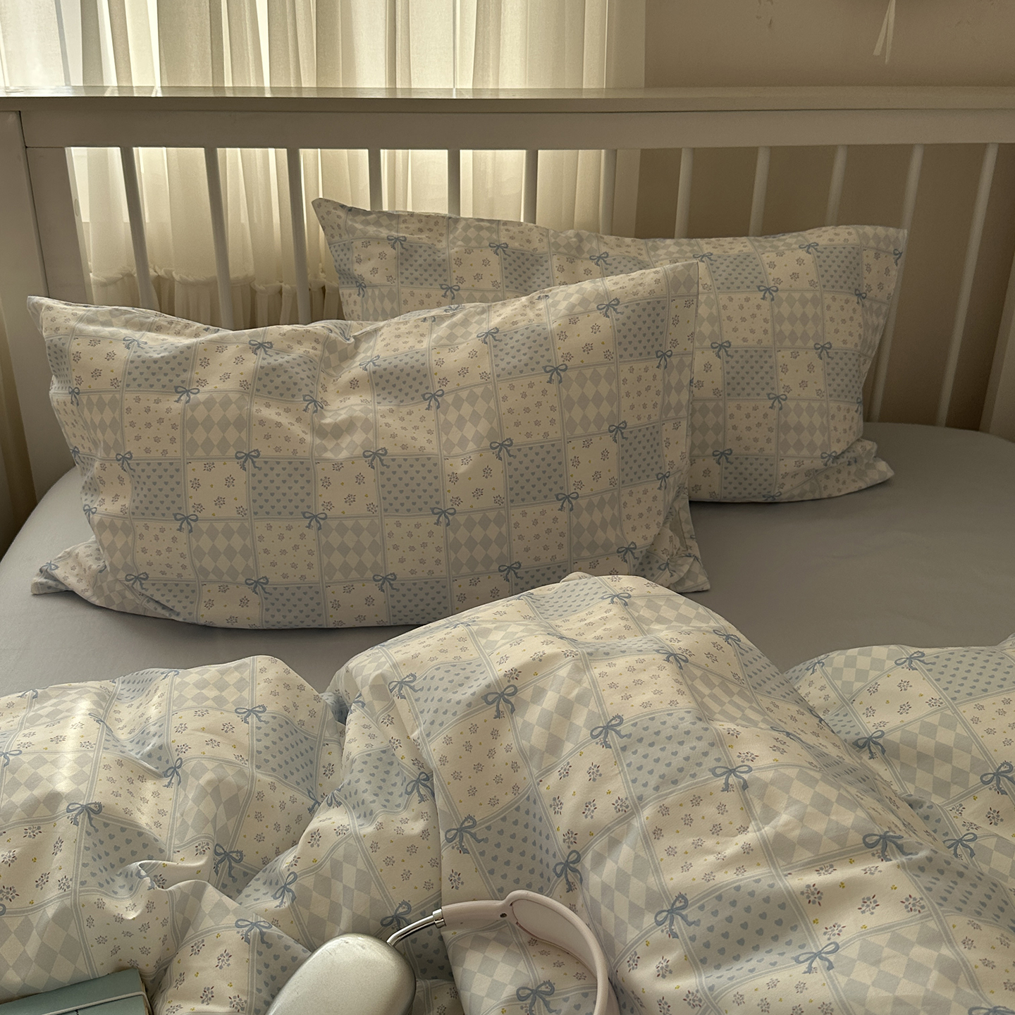 商品名称:尺素 2026新款纯棉卡通ins风四件套可爱少女风全棉被套纯色1.8床笠加大床单学生1.2三件套 蓝白情书--浅蓝
