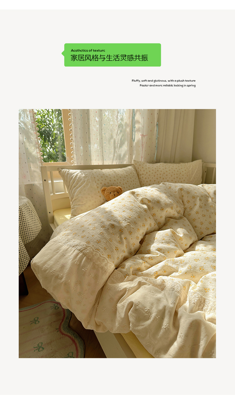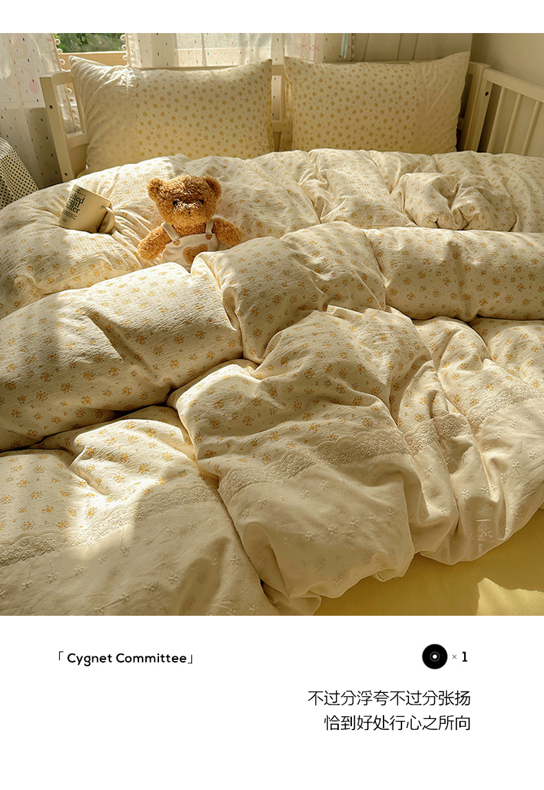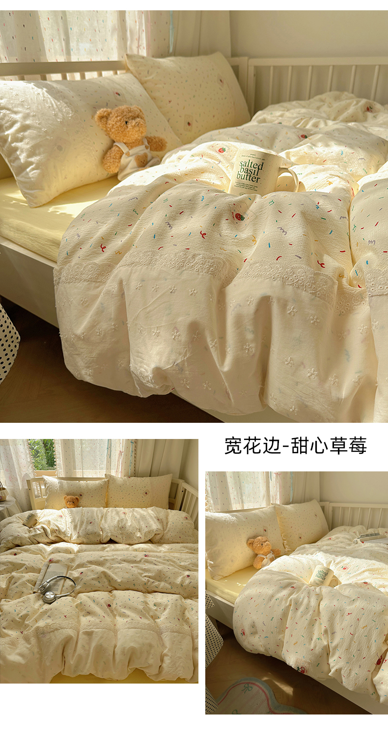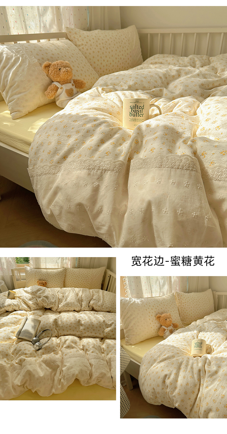 (总)沐芷 2026 【提供买家秀】宽花边四件套公主风A类双层纱床上用品三件套被套床笠,宽花边-蜜糖黄花,宽花边-甜心草莓,宽花边-点点蓝波,宽花边-花园小兔,宽花边-奶萌小狗,宽花边-晚安小紫