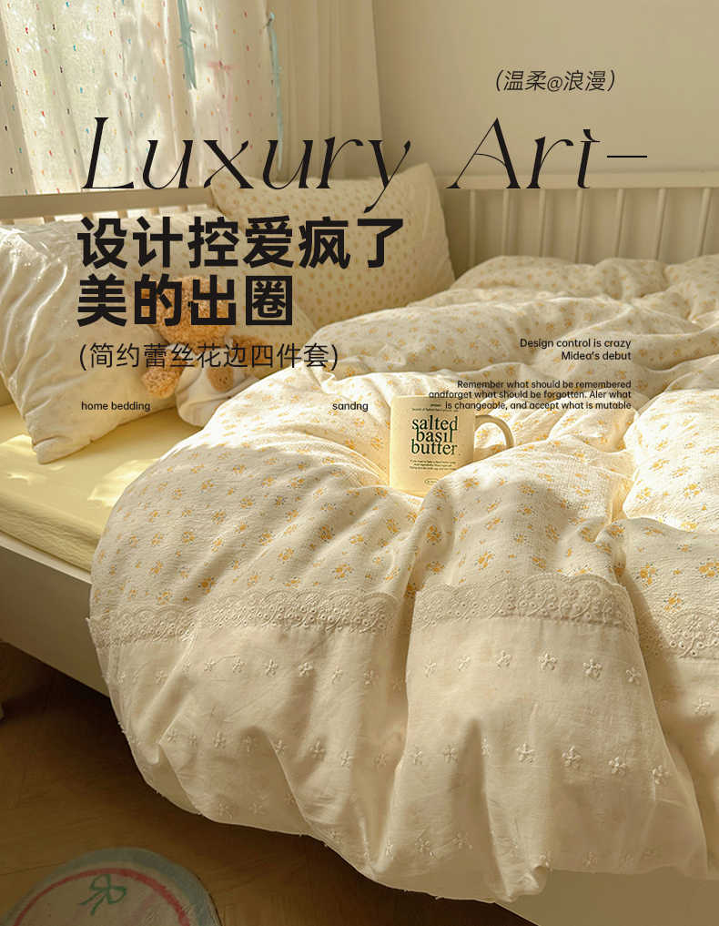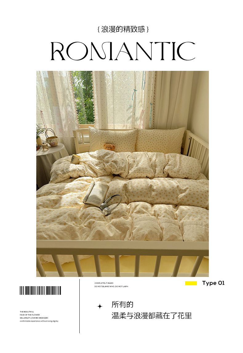 (总)沐芷 2026 【提供买家秀】法式风花边四件套A类仿棉 简约小清新床上用品被罩被套,花边恋曲-黄,花边恋曲-蓝,花边恋曲-绿,花边恋曲-玉,花边恋曲-紫