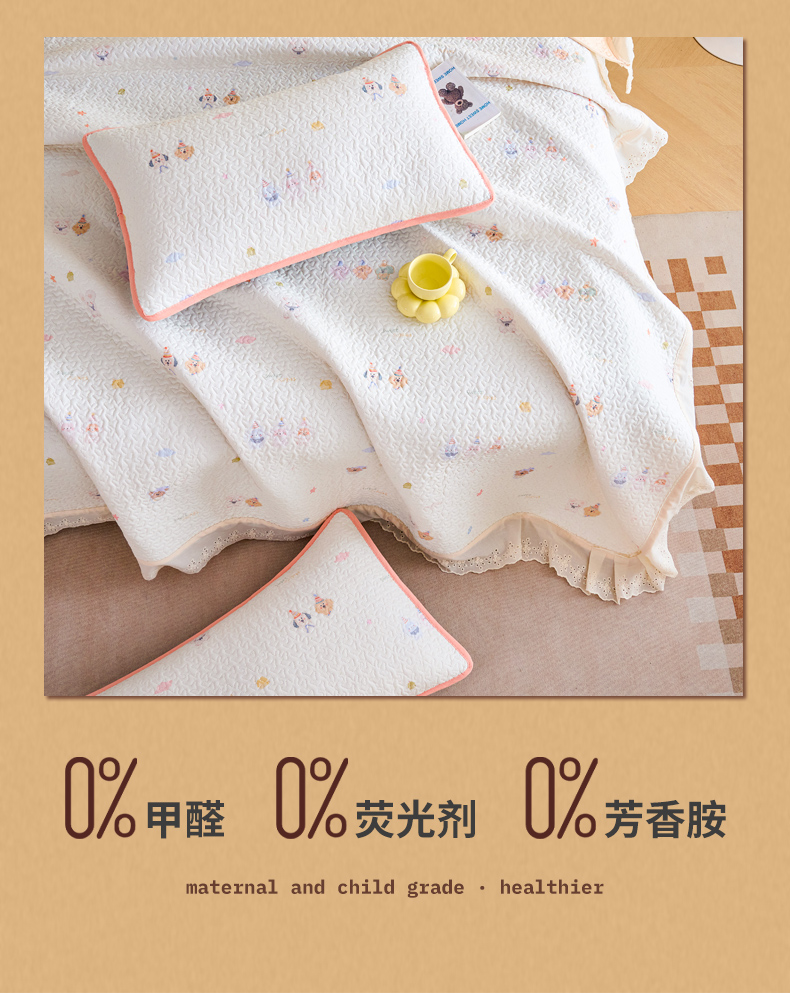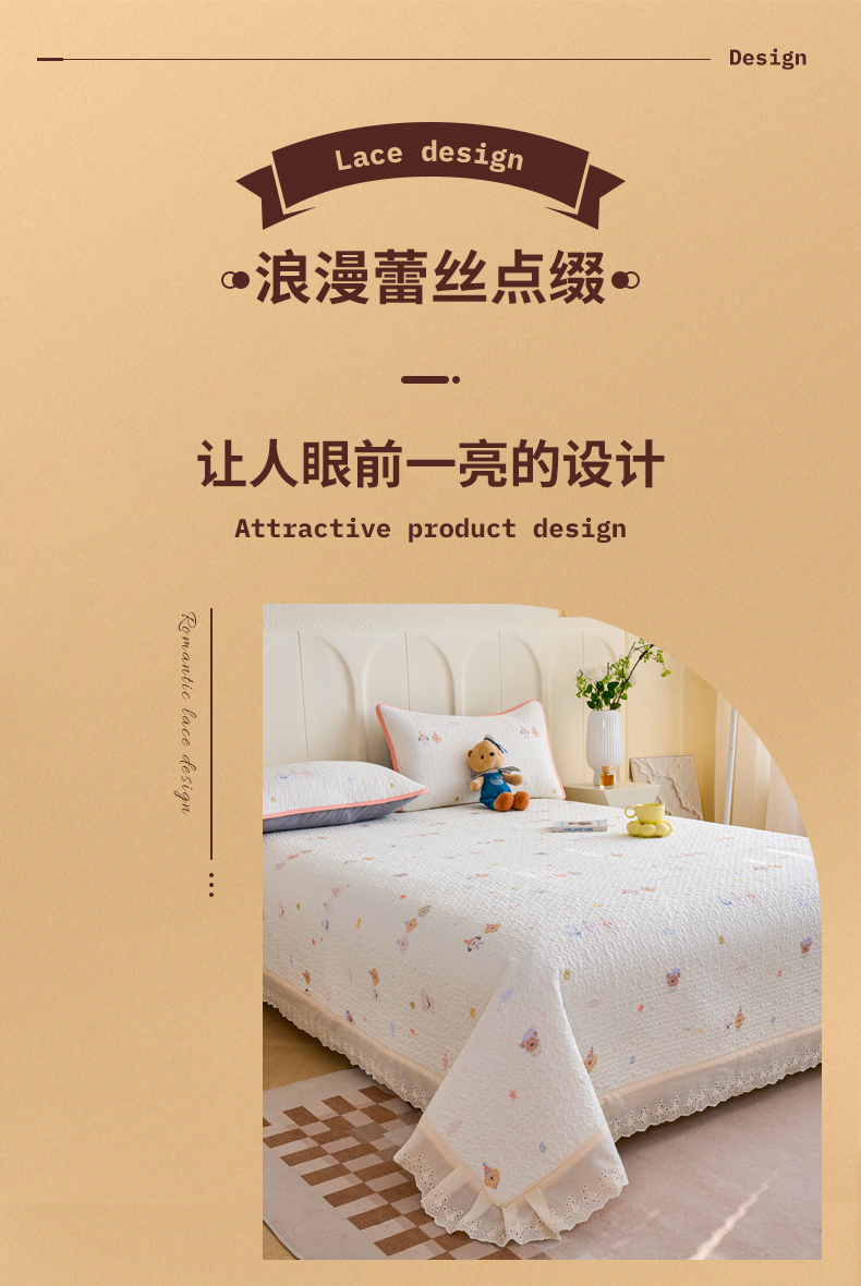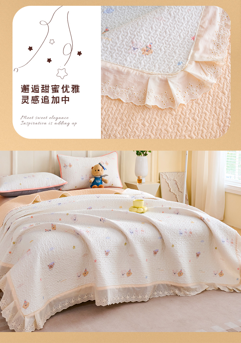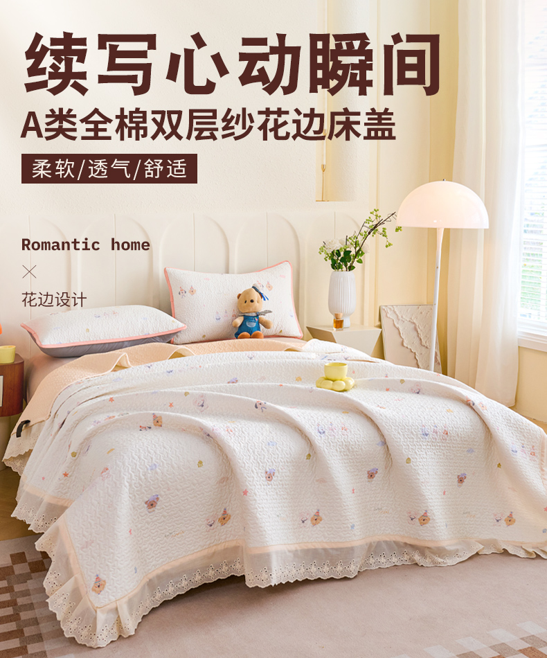 • 91家纺网 家纺一手货源 找家纺 拾小柒 2026年新款全棉双层纱床盖花边法式中古奶油风防滑床盖三件套 豆豆好朋友