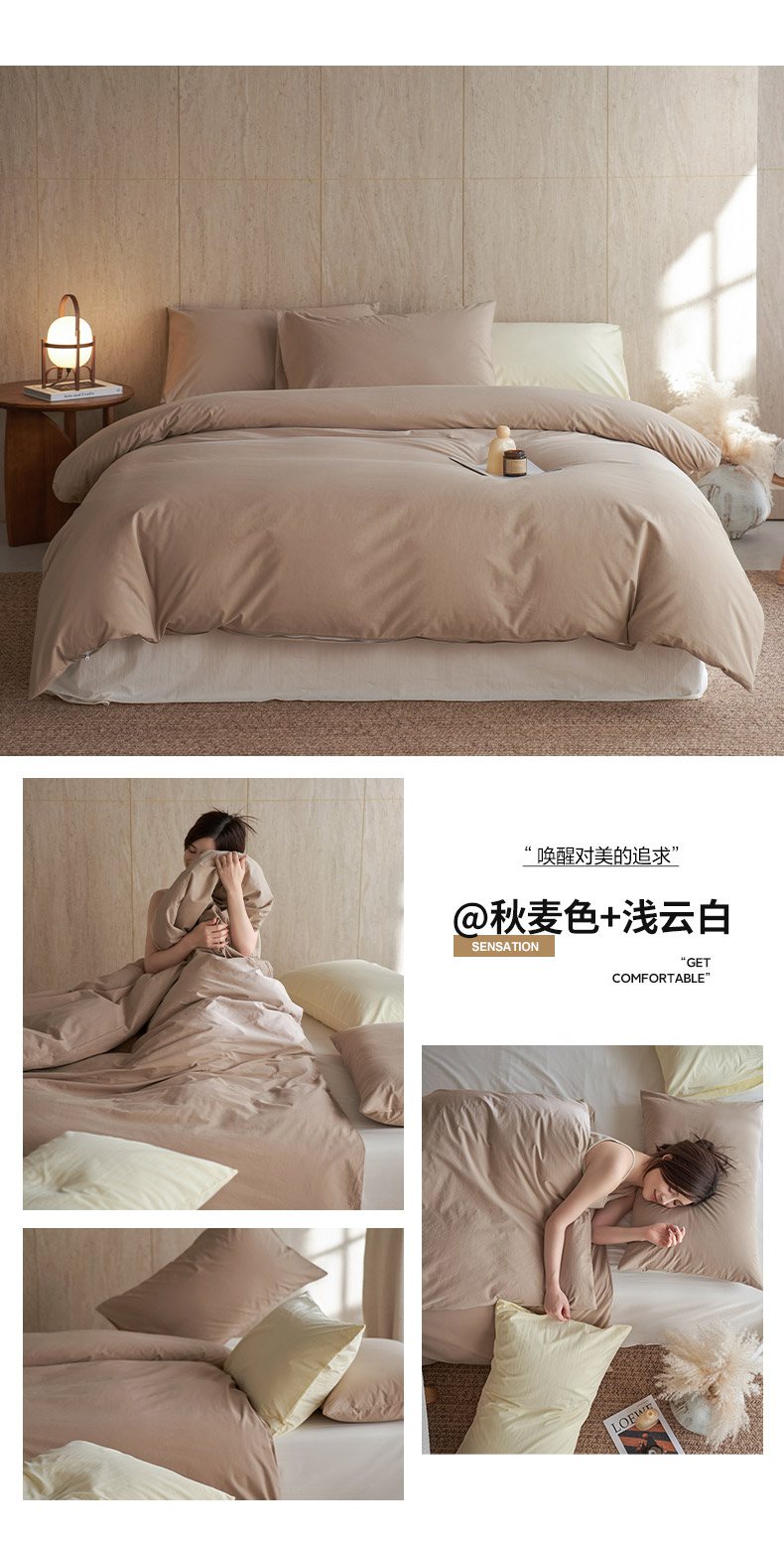 当前位置: 91家纺网 > 商品网购 > 床品套件 > 四件套 > 全棉普通四件套 > 轩和家居 2026新款全棉高支旧感砂洗长绒棉拼色四件套 秋麦色+浅云白