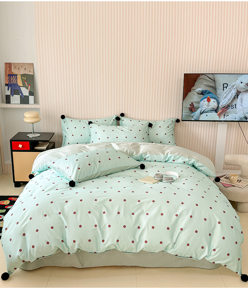 雅居纺家纺 2026新款50长绒棉波点球球四件套 蓝点球球