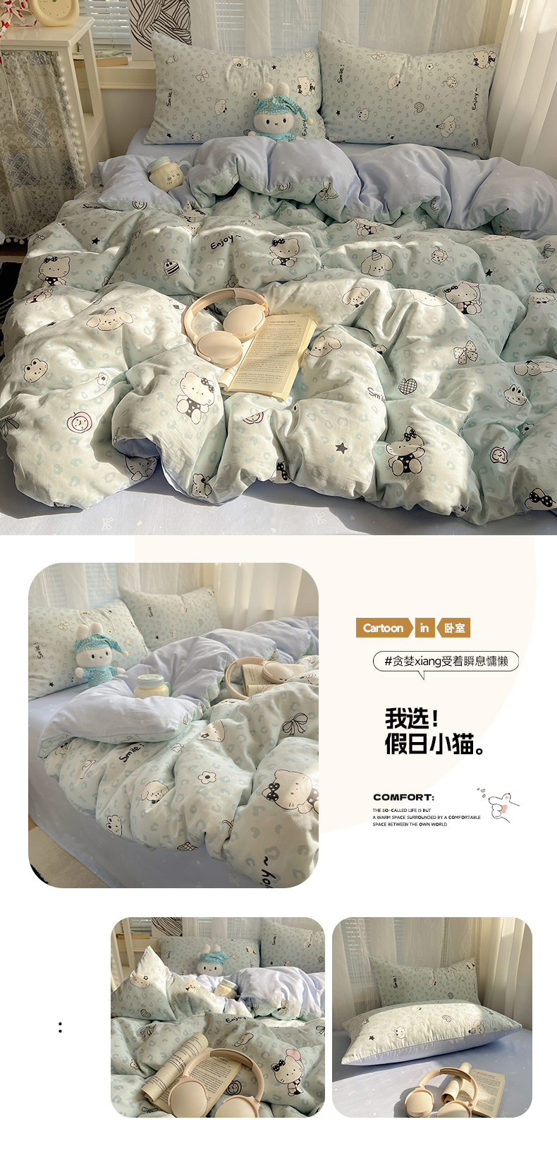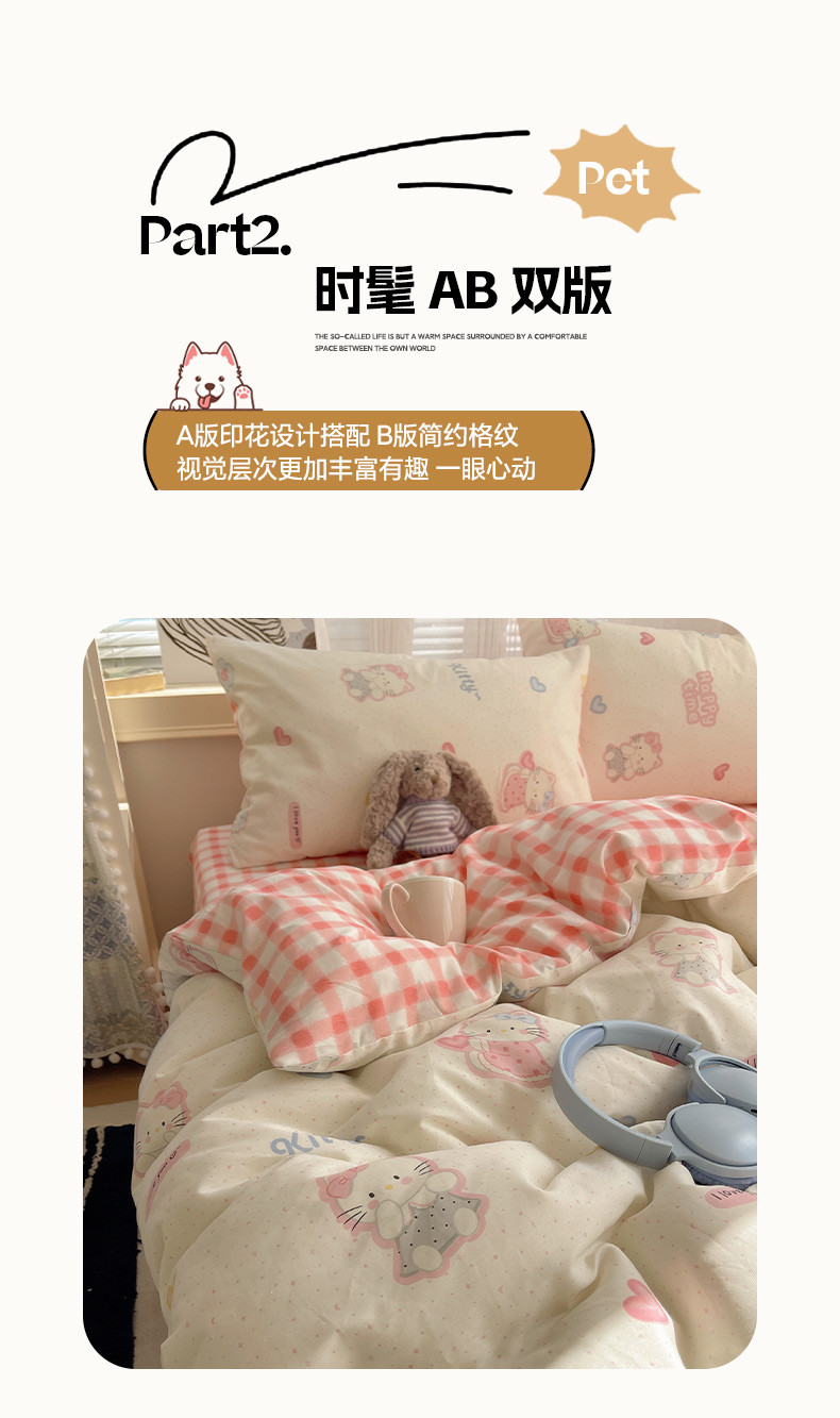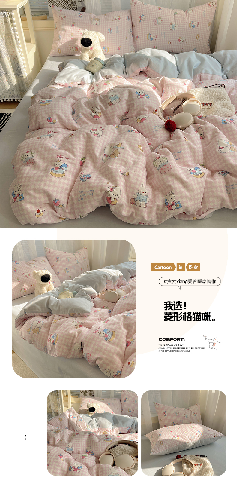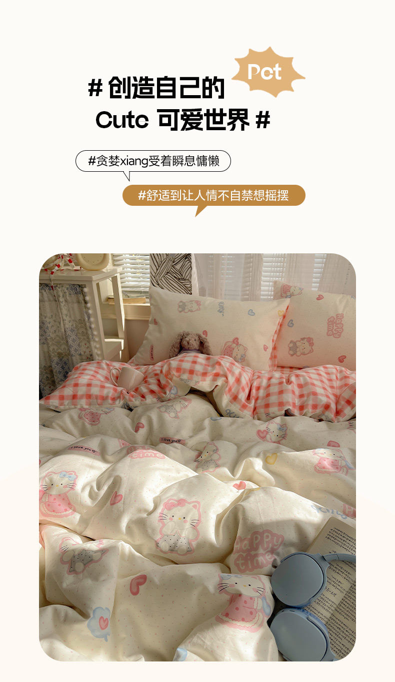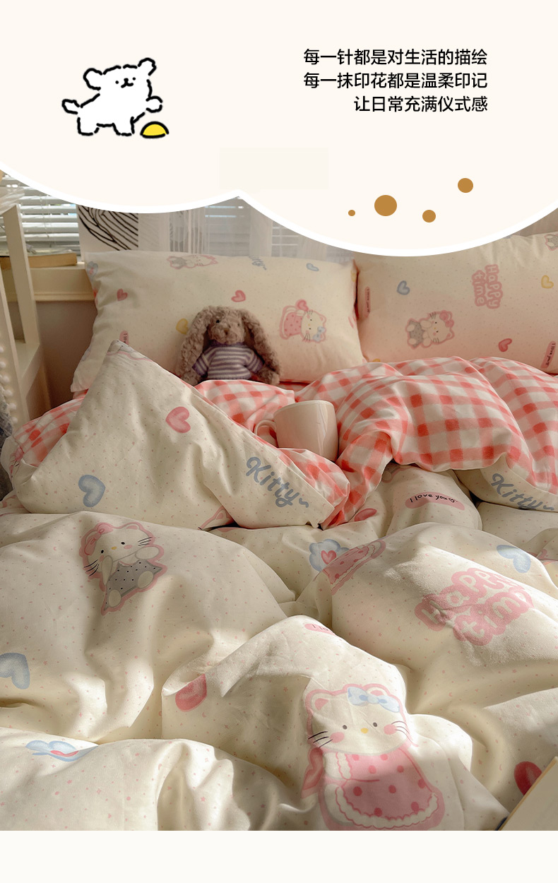 (总)雅居纺家纺 2026新款全棉卡通印花可爱小猫四件套,快乐小猫,爱心小猫,粉点猫咪,假日小猫,菱形格猫咪,猫咪伙伴