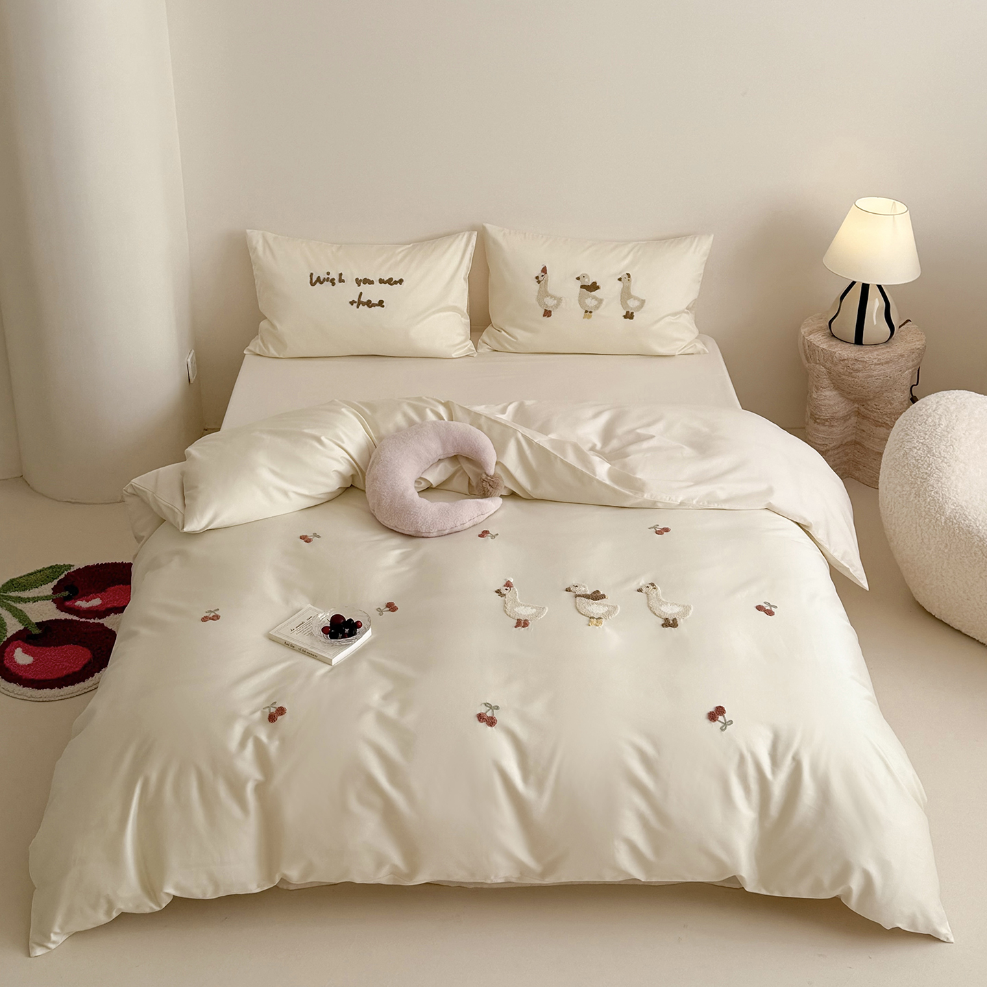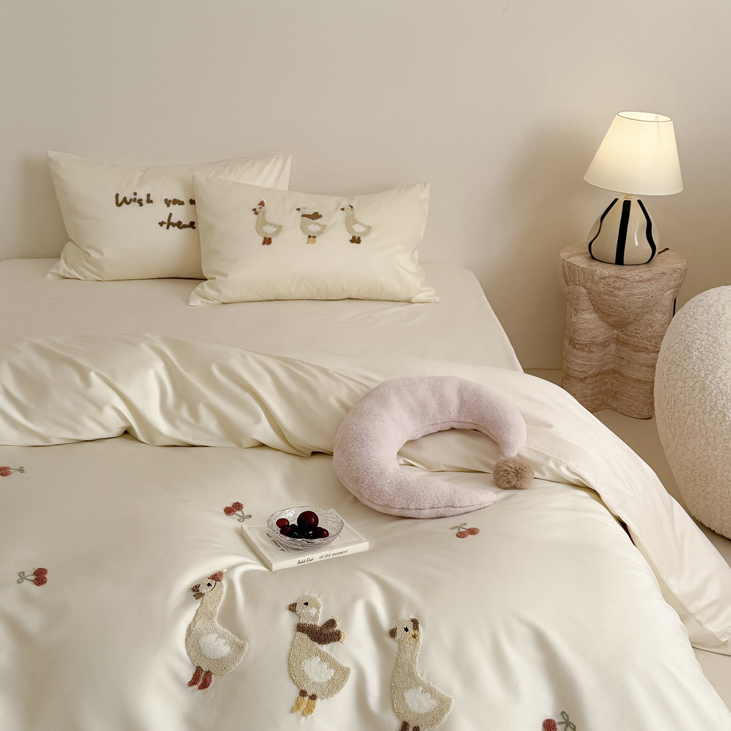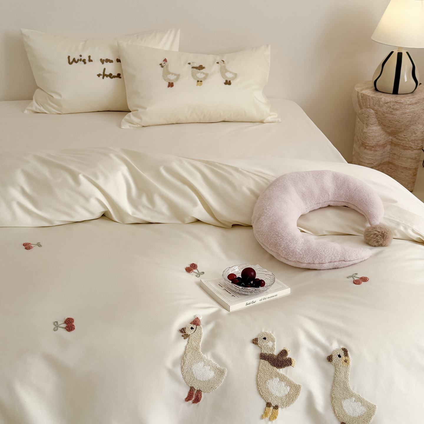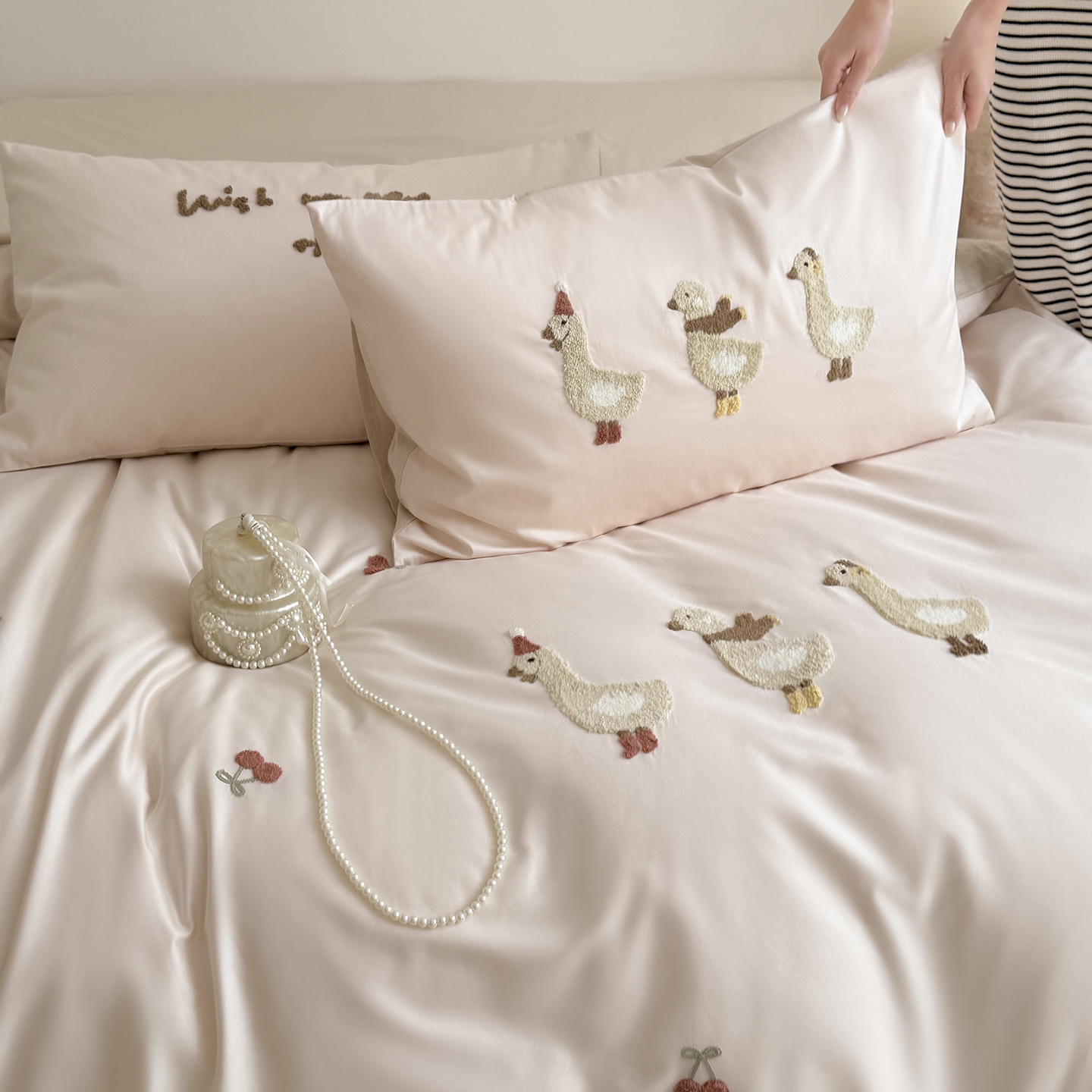 商品名称:鹿班家居 2026春季新品100S长绒棉毛巾绣系列四件套-野游去鸭(标准会员-20元) 野游去鸭-粉色