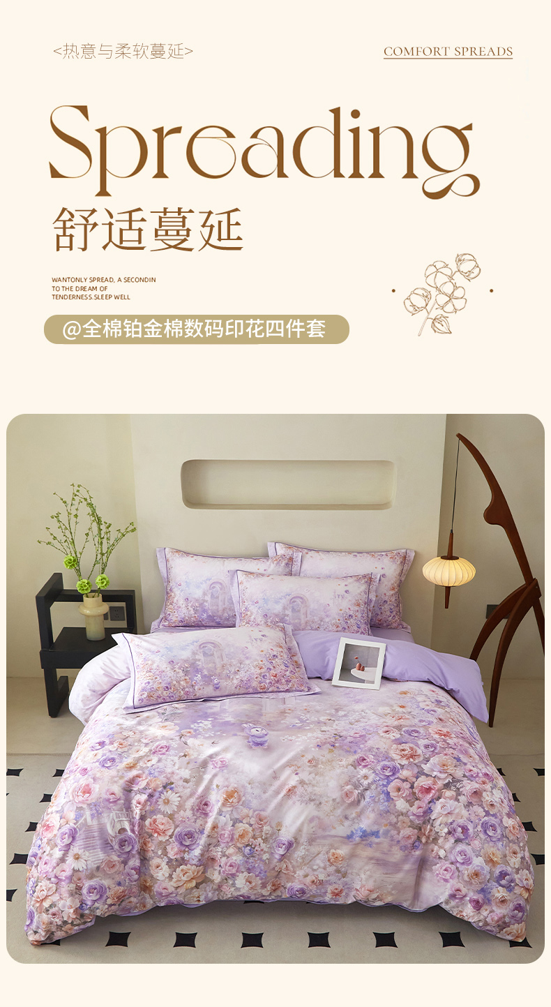 (总)启航家居 2025新款全棉铂金棉数码印花四件套,风香花倦,花的嫁纱,洛香忆梦绿,暮云春树灰,翩若惊鸿粉,普罗旺斯紫,新塞纳舞曲红,新塞纳舞曲紫