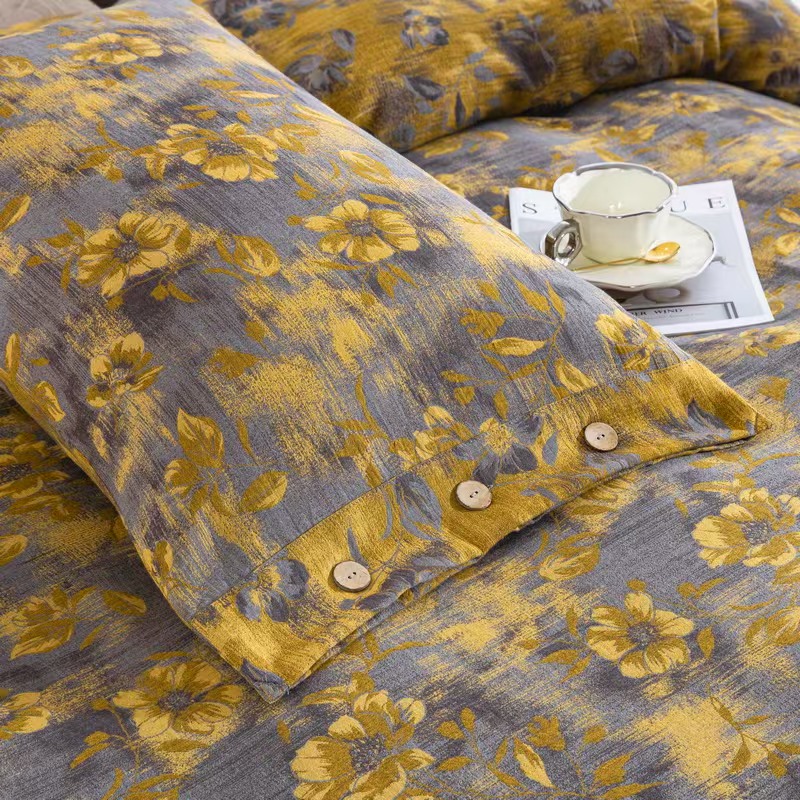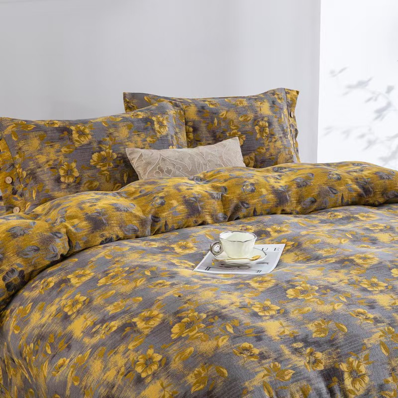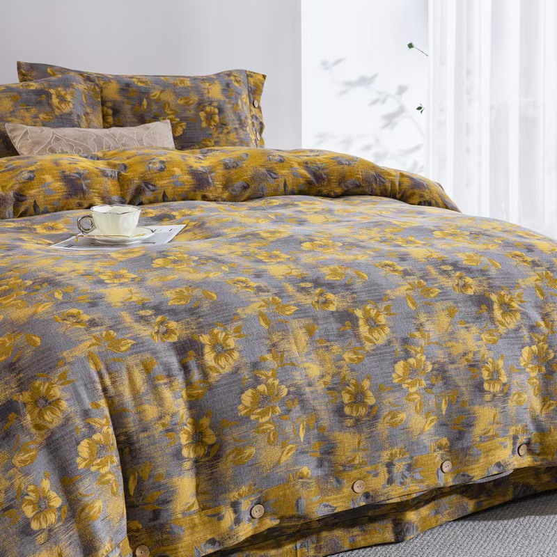(总)双层纱家居 2025新款全棉纯棉色织提花双层纱纽扣款四件套-花韵影