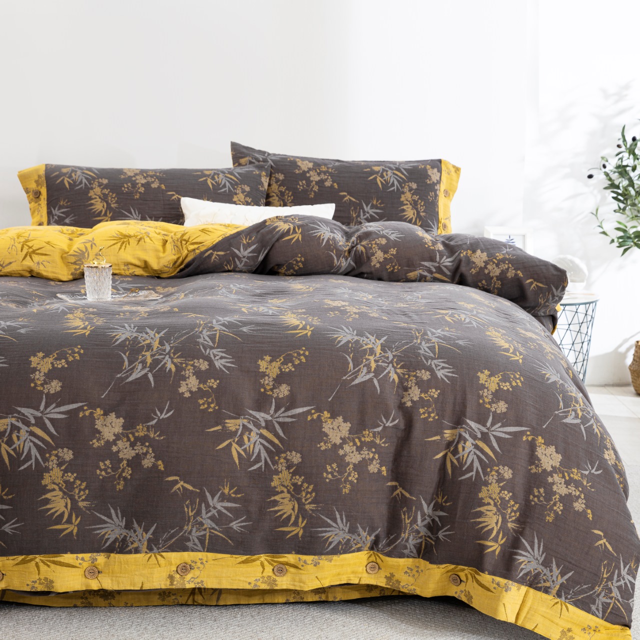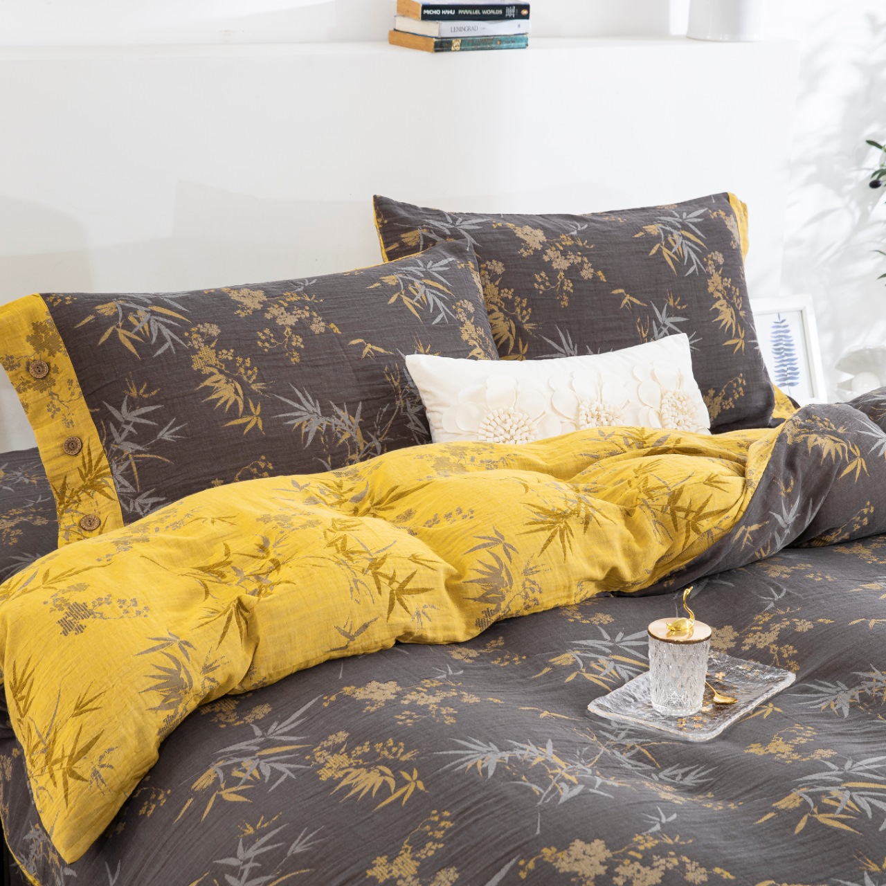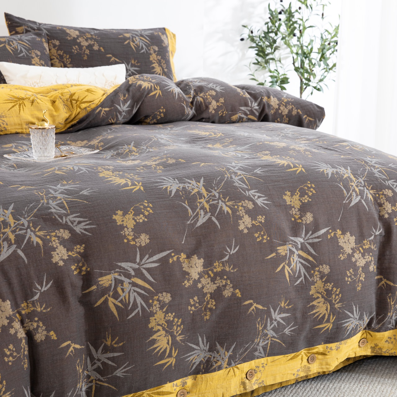 双层纱家居 2025新款全棉纯棉色织提花纽扣款四件套-竹韵 竹韵-黑金
