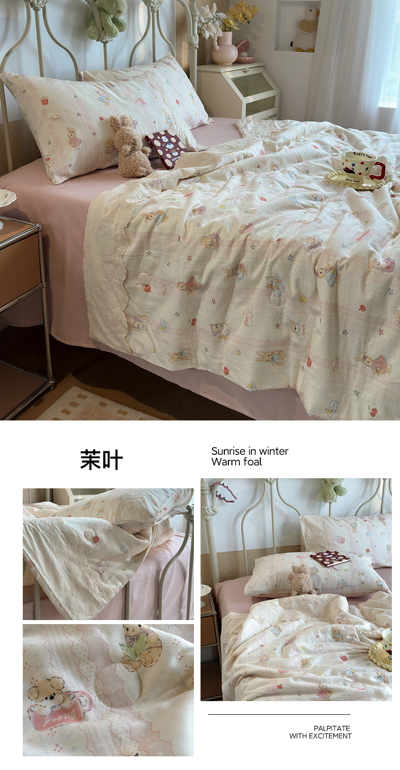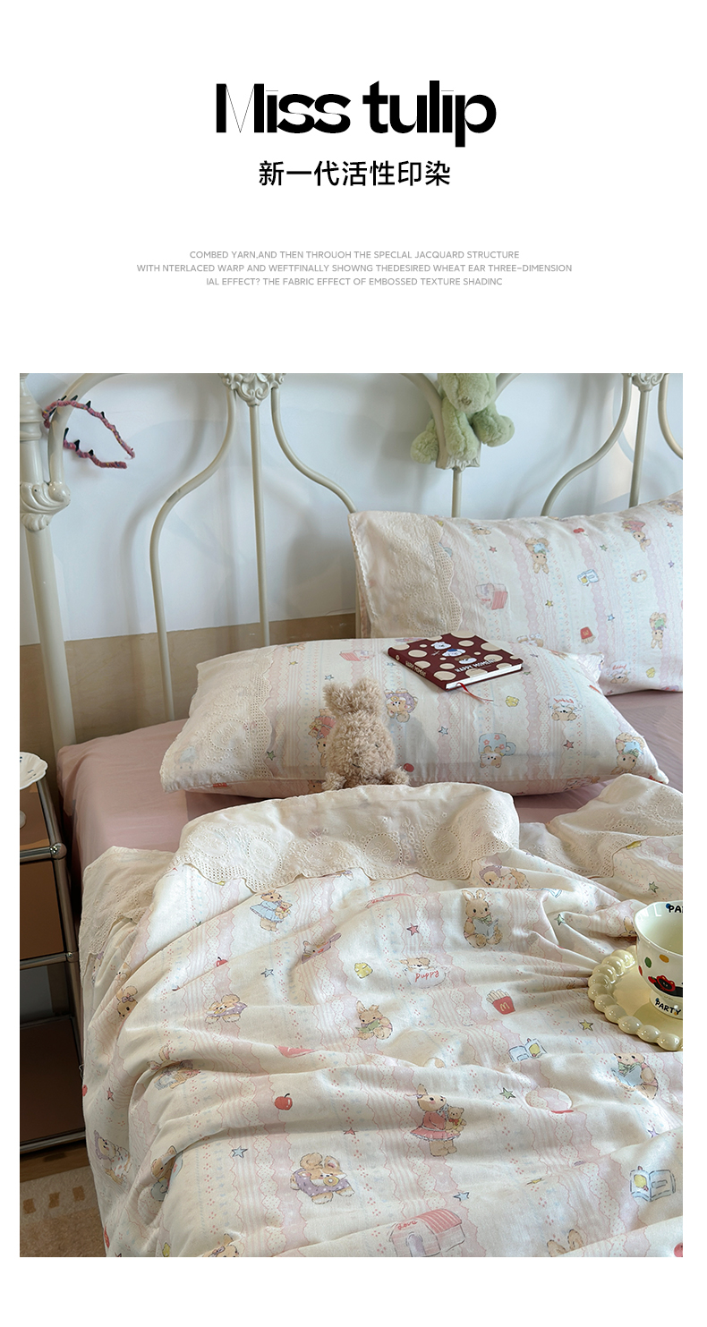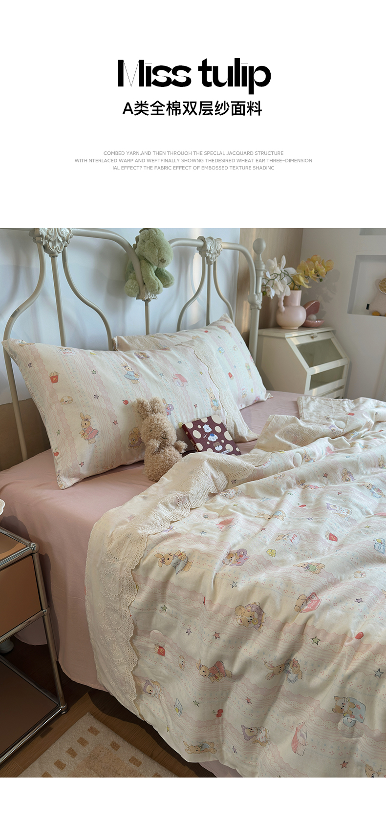 当前位置: 91家纺网 > 商品网购 > 床品套件 > 四件套 > 夏被四件套 > 绫韵家纺 2026夏季新品A类全棉双层纱法式大花边夏被四件套 茉叶