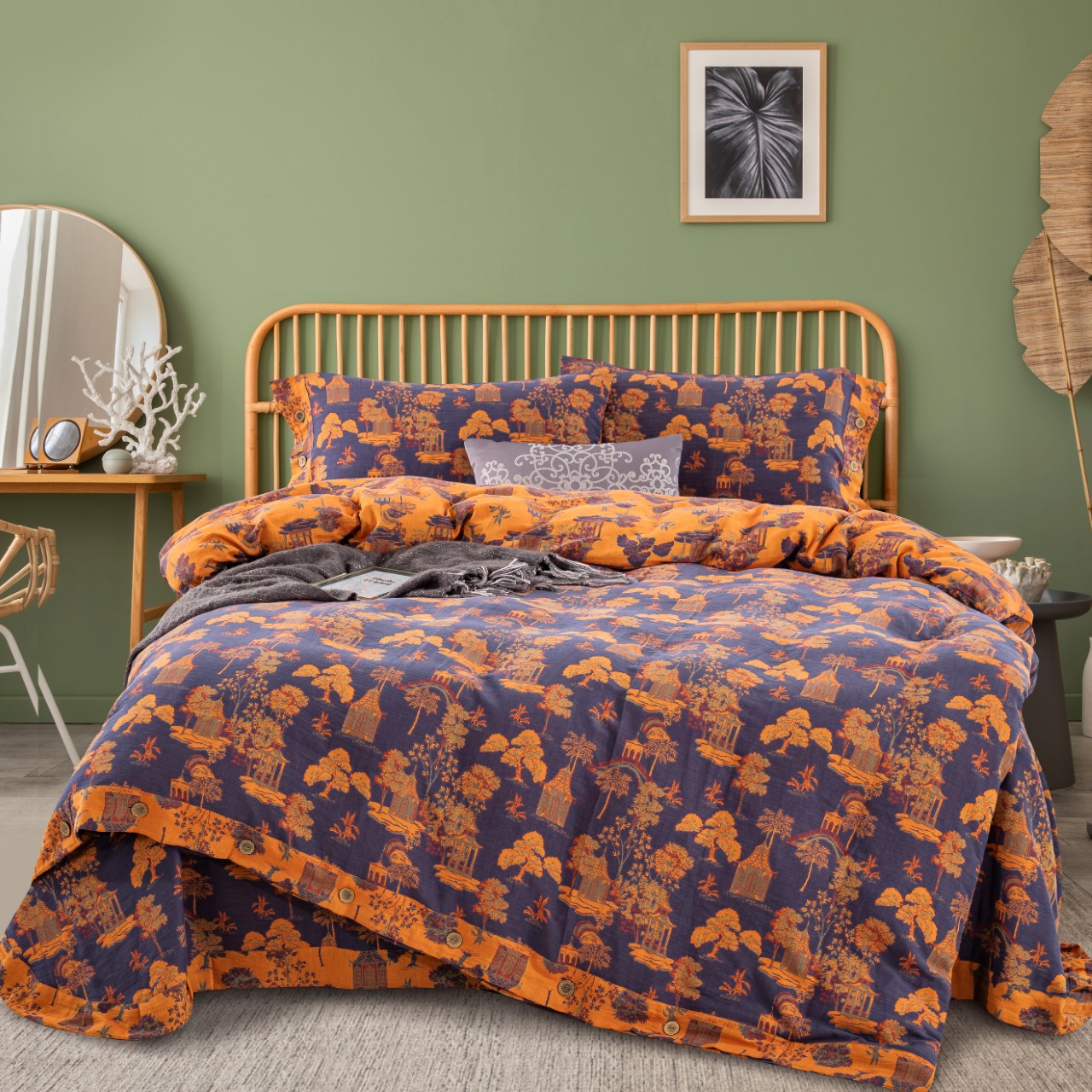 商品名称:双层纱家居 2026新款森林庭院全棉纯棉色织提花纽扣款四件套 森林庭院-藏青