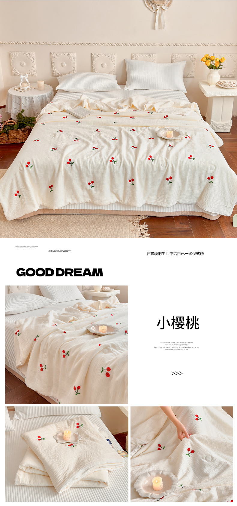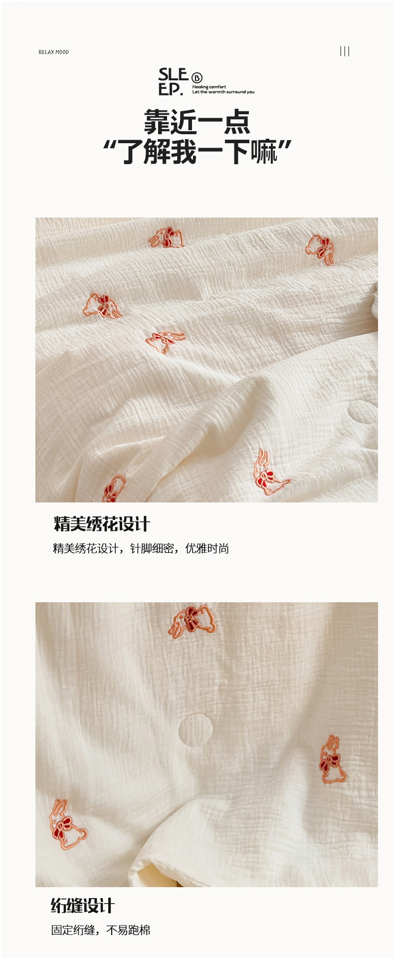 • 91家纺网 家纺一手货源 找家纺 (总)木楌家居 2026新款全棉皱皱纱刺绣款夏被床盖四件套,蓓蕾,蝴蝶结,领结兔,枇杷叶,三叶草,小飞象,小玫瑰,小樱桃,星眠,幸运熊,云裳,枝意,组合图仅供参考不可下单
