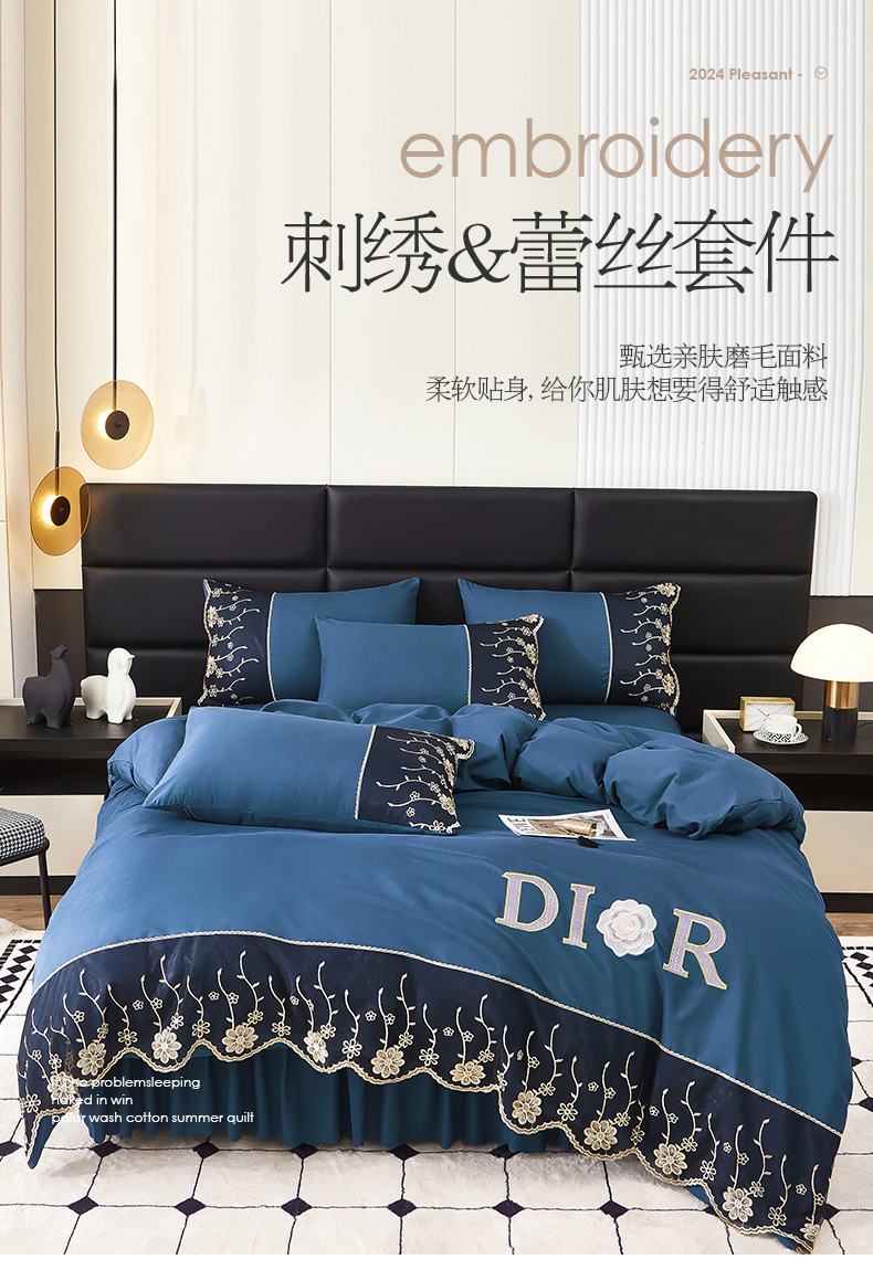 商品名称:(总)沐珩家纺 2026新款亲肤磨毛蕾丝刺绣床裙四件套-蒂欧系列