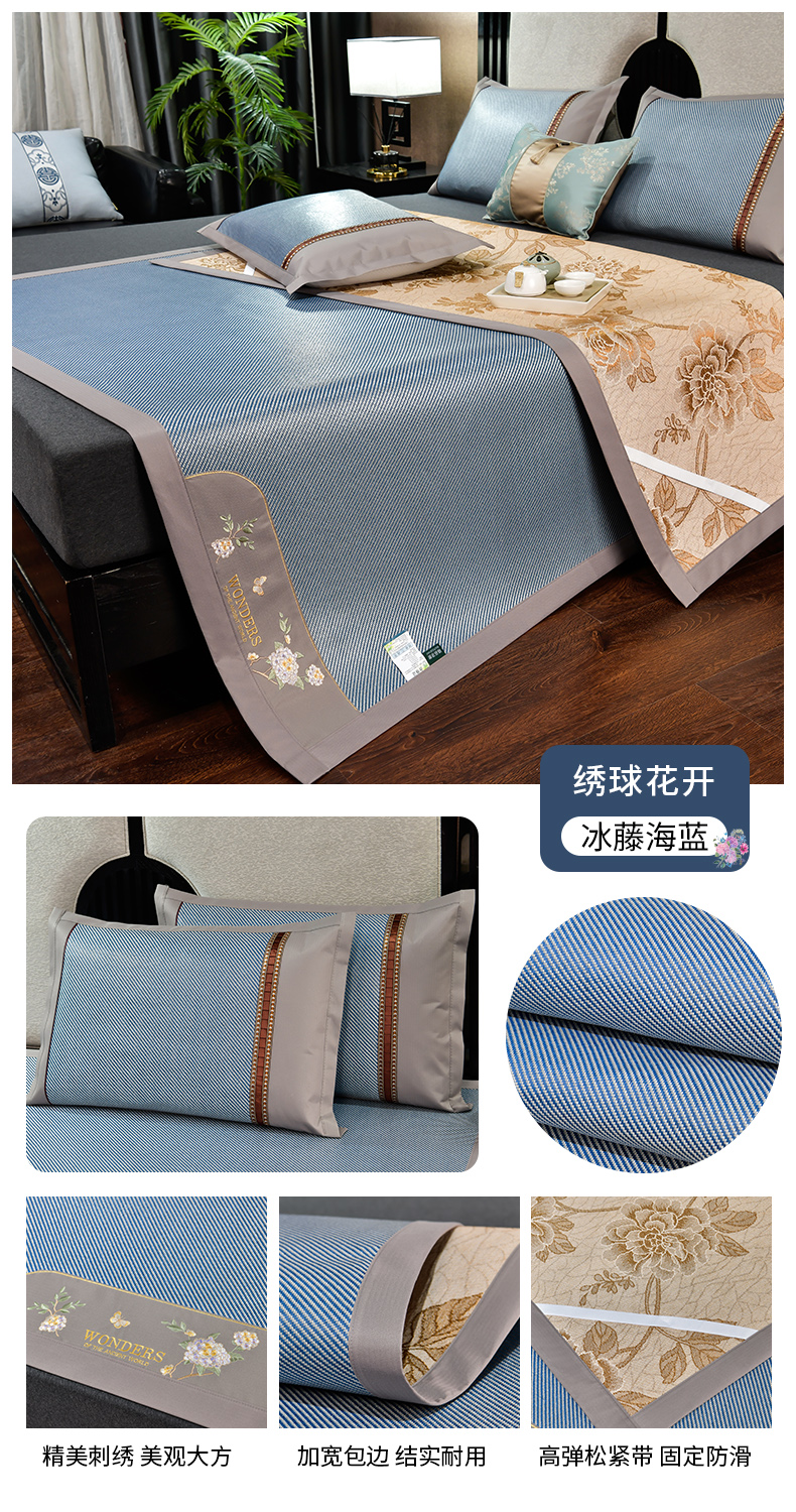 商品名称:小牛席业 2026新款绣球花开-冰藤双面席凉席藤席冰藤席竹席空调席草席冰丝席豆豆席乳胶席三件套 绣球花开-提花蓝色