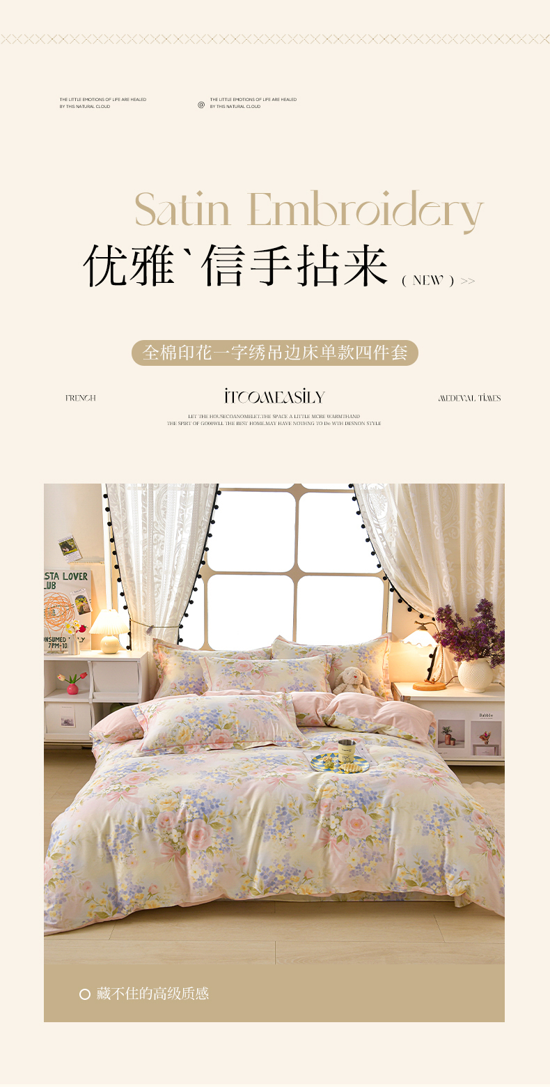 商品名称:绘萱家居 2026直播爆款一字绣吊边款纯棉100%全棉四件套印花百分百(喷气高品质) 水墨嫣然