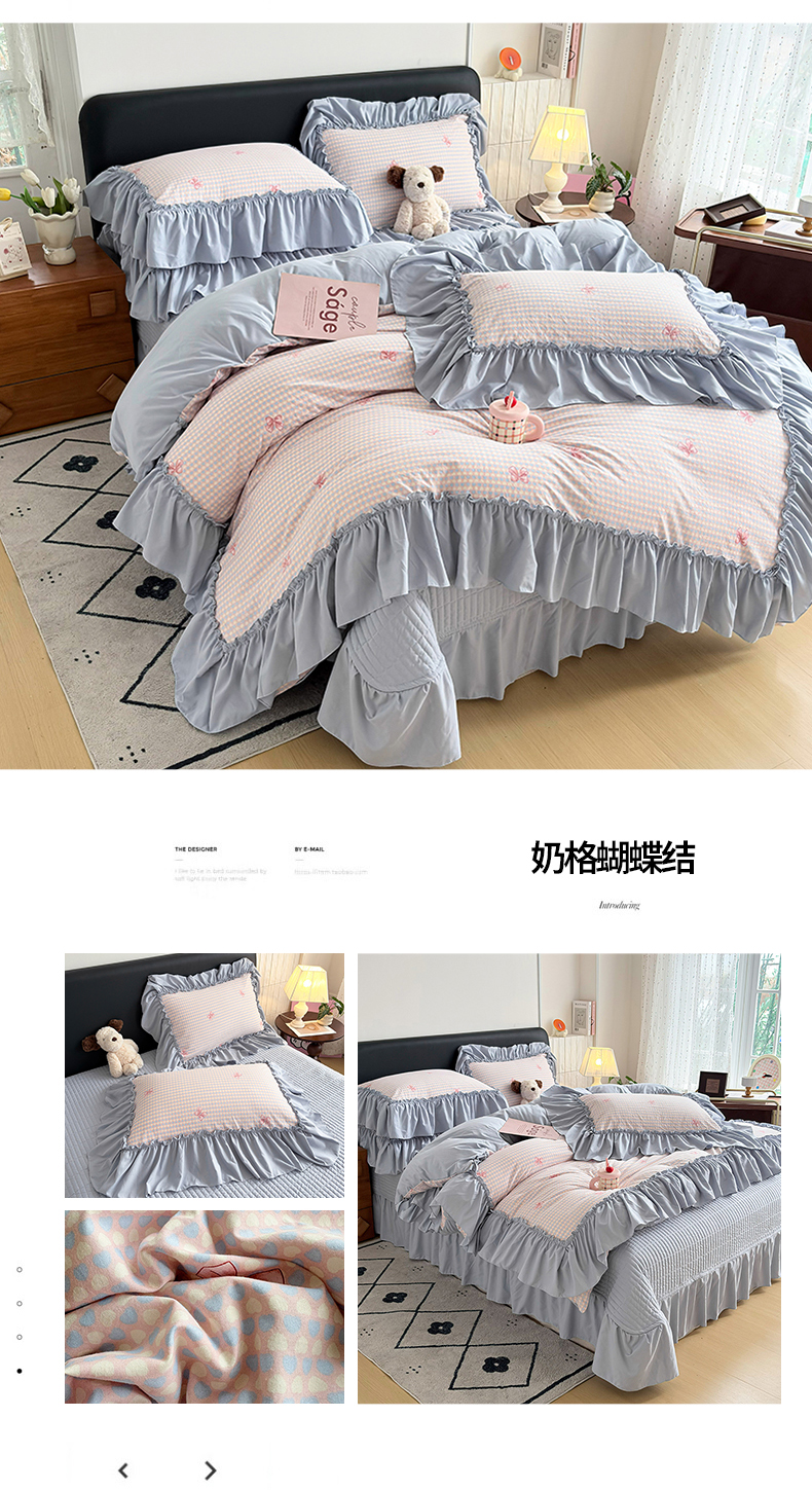 当前位置: 91家纺网 > 商品网购 > 床品套件 > 四件套 > 其它四件套 > 2026 铠畅新款韩系古法韩国水洗棉仿棉云感棉法式浪漫大花边床盖四件套 奶格蝴蝶结