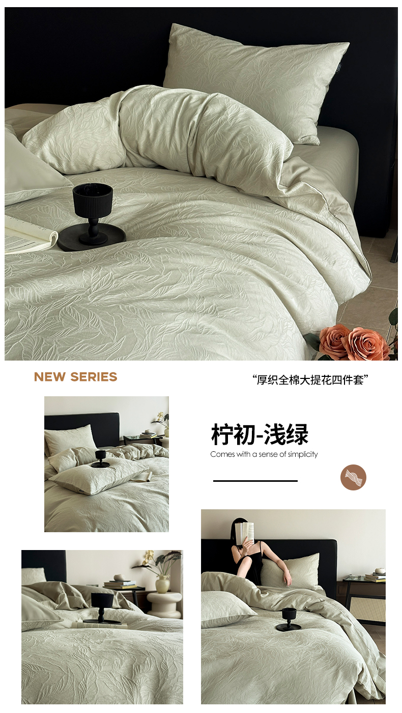 当前位置: 91家纺网 > 商品网购 > 床品套件 > 四件套 > 提花四件套 > 宜代光年 2026年新款全棉纯棉厚织提花四件套系列(第一批花型) 柠初-浅绿