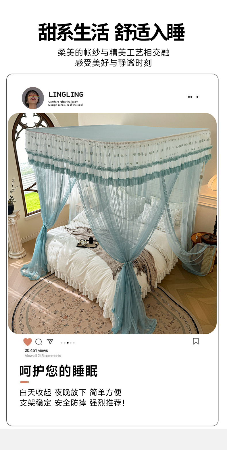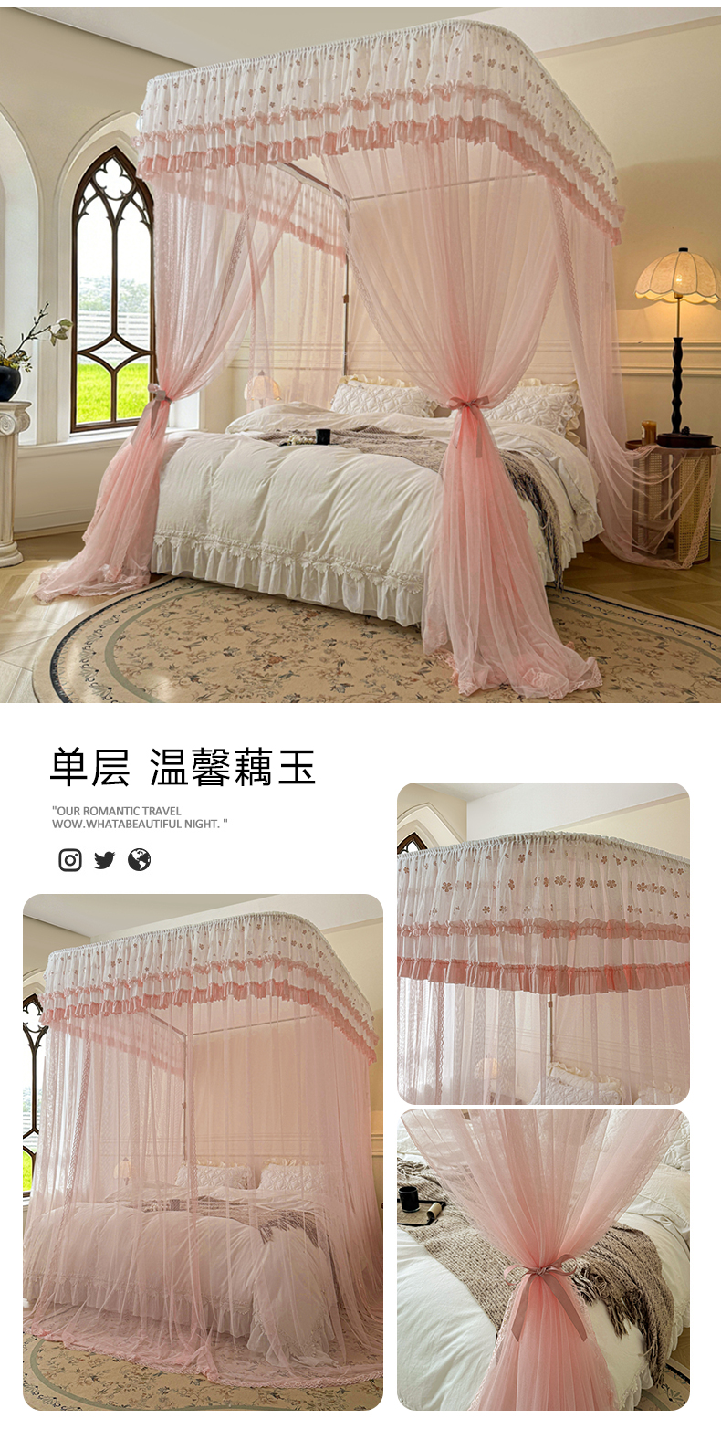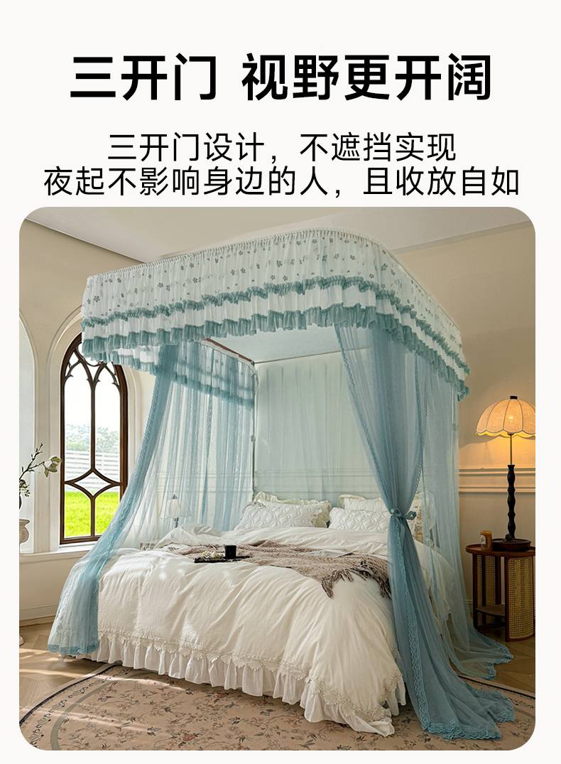 (总)2025新款双层花边全包围床笠款三开门蚊帐-幽梦星辰,奶黄,藕玉,颜淡蓝