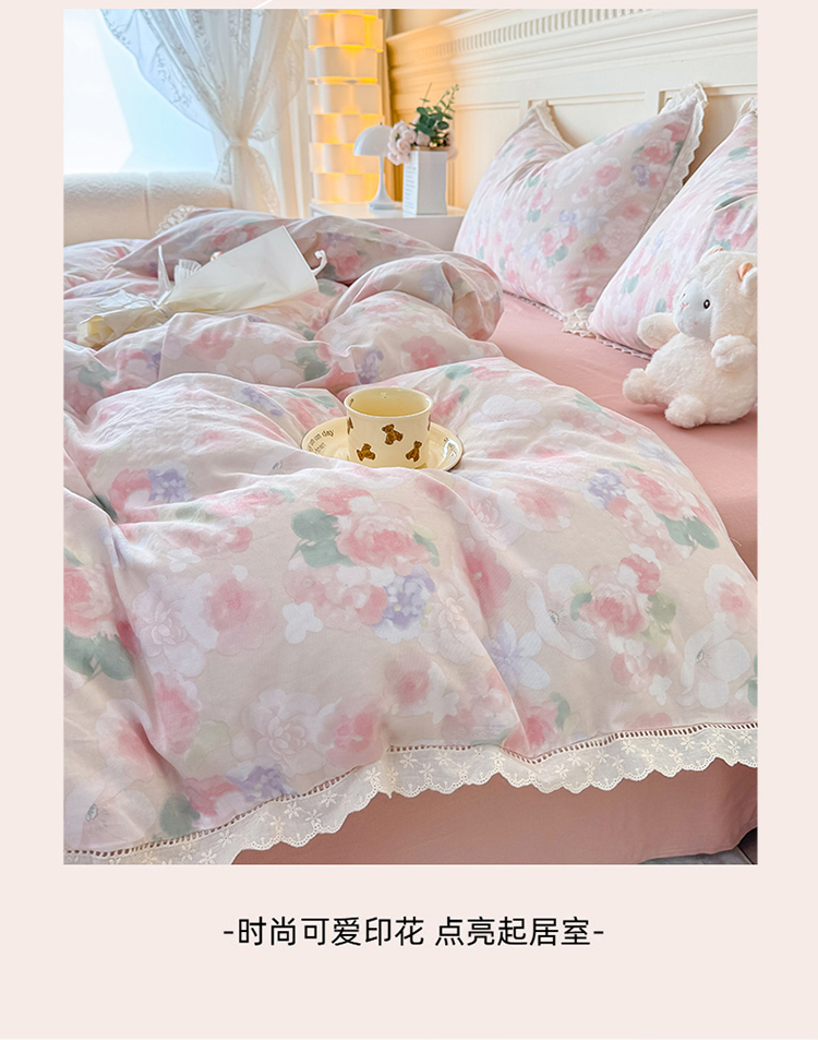 当前位置: 91家纺网 > 商品网购 > 床品套件 > 四件套 > 全棉普通四件套 > 疆东 【疆东】2026韩版蕾丝花边纯棉全棉双层纱四件套印花纯棉四件套法式赫本木耳花边全棉公主双层纱四件套 夕颜