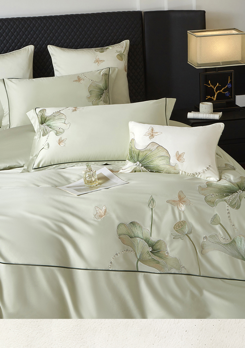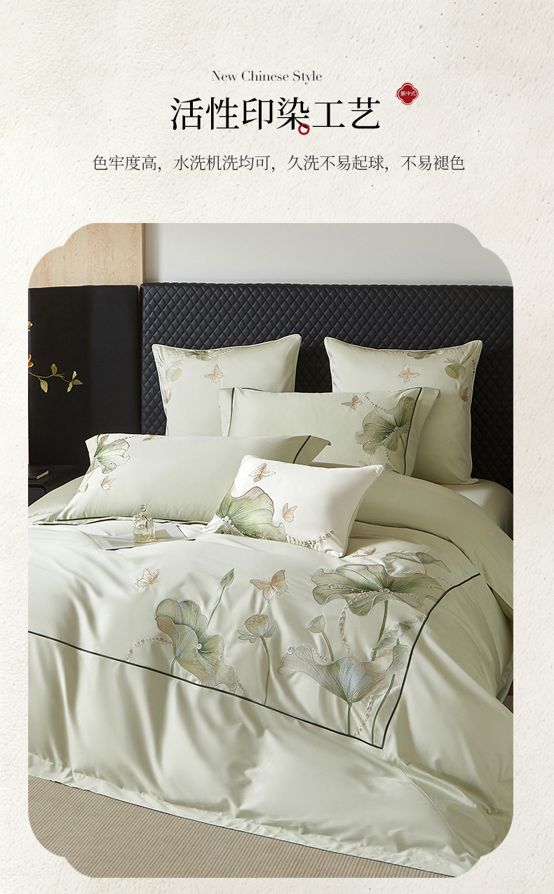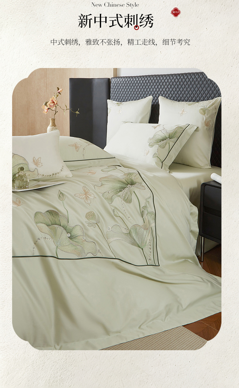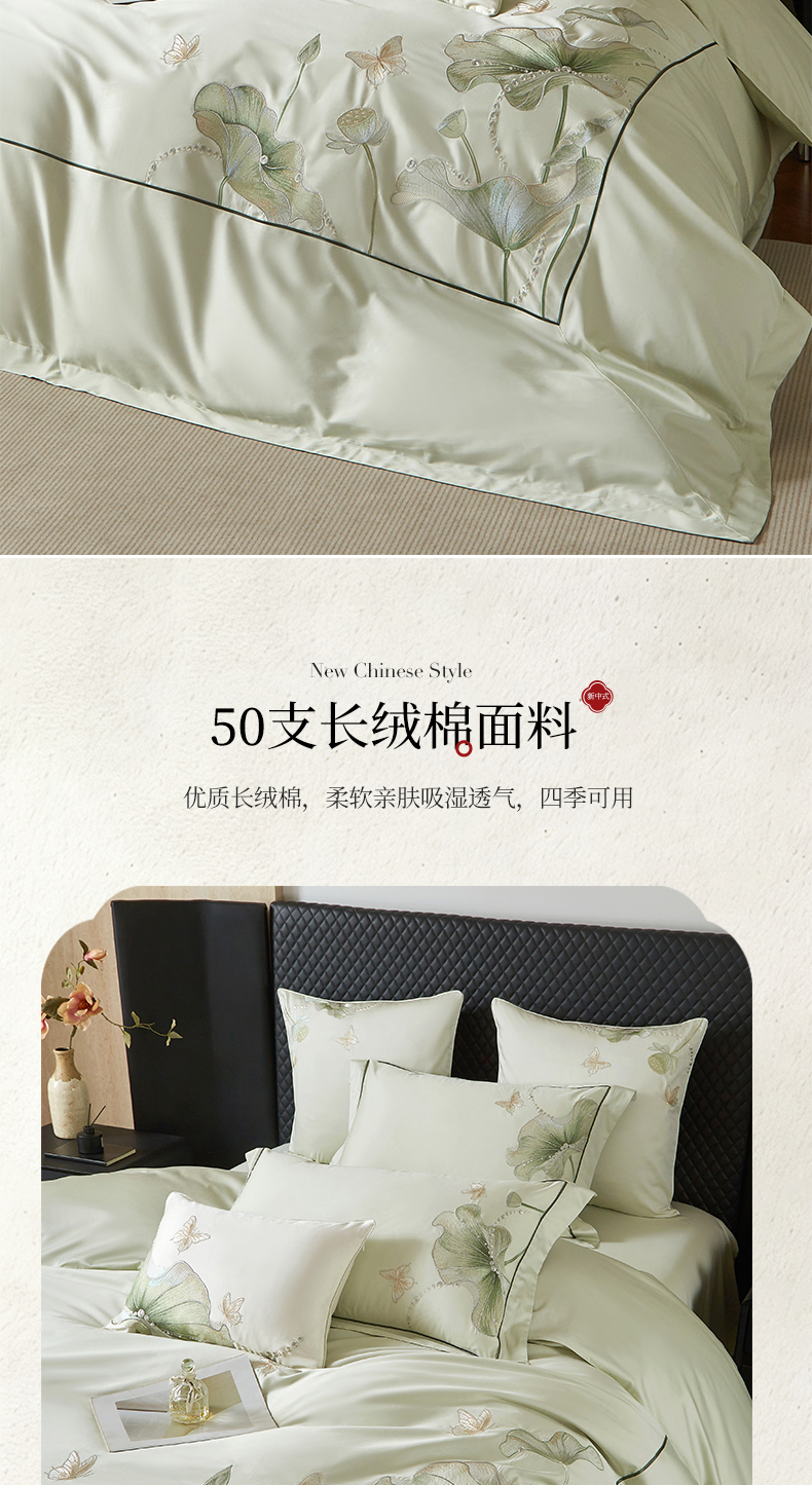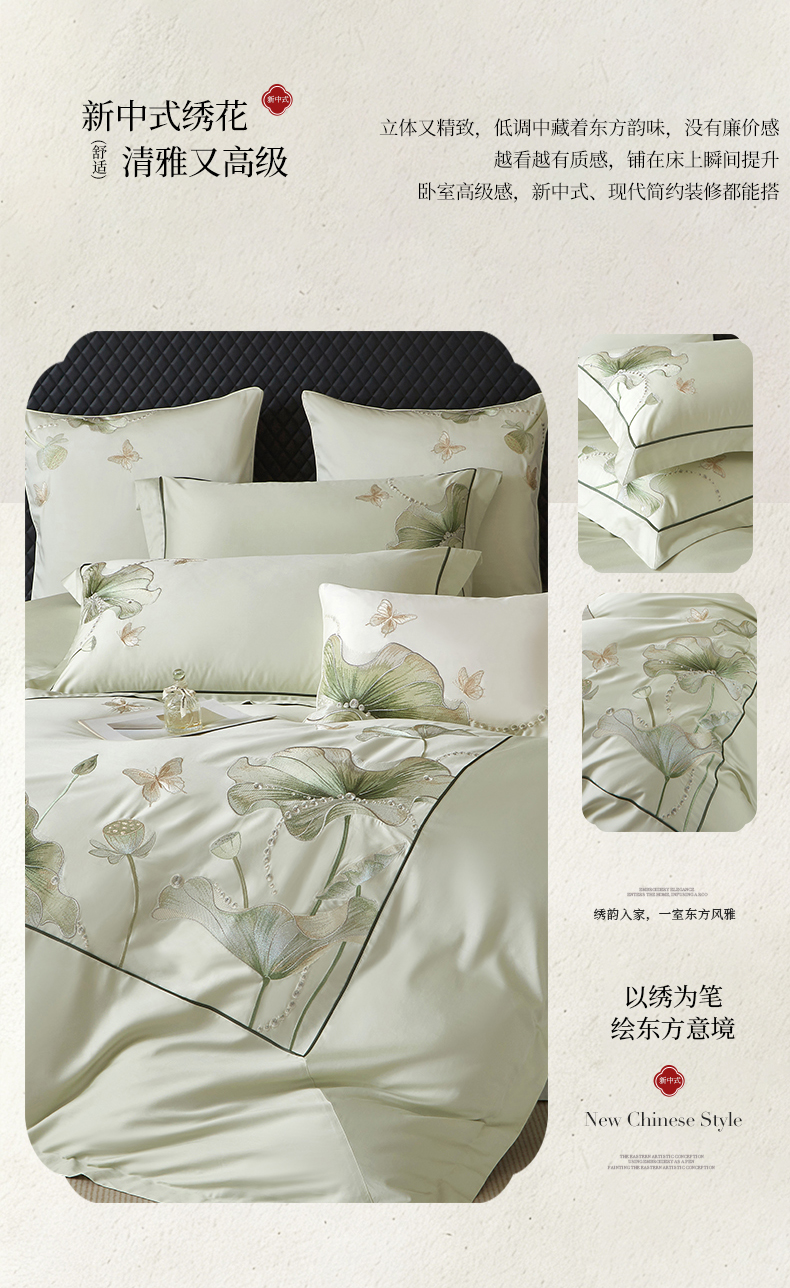 (总)50支50S长绒棉刺绣四件套新中式工艺款,荷塘月色粉 控价478-498元,荷塘月色玉 控价478-498元,翩翩起舞 控价478-498元,温馨满园粉玉 控价478-498元,温馨满园芋紫 控价478-498元,玉露清华 控价478-498元