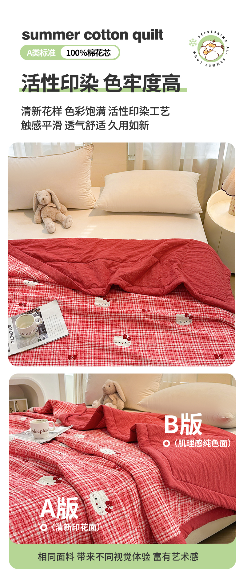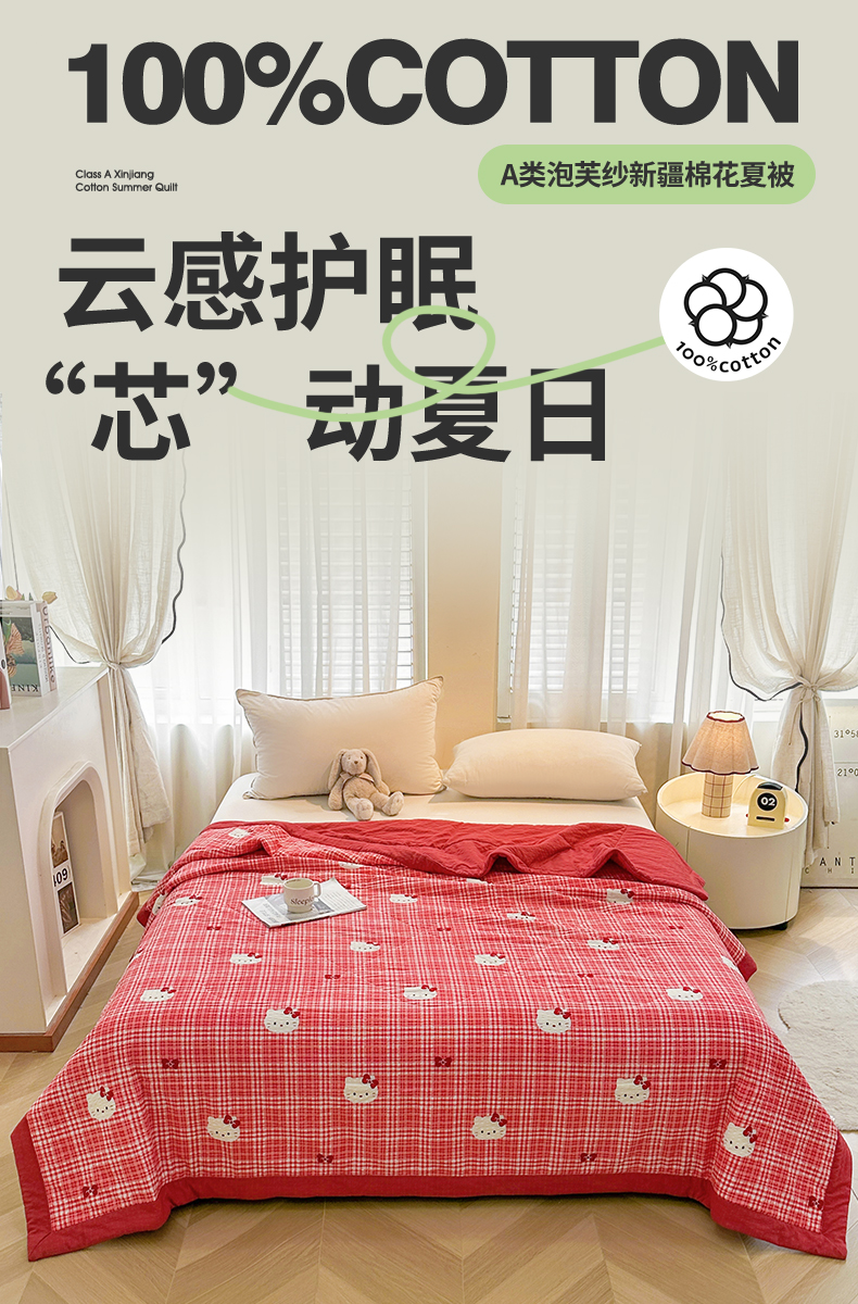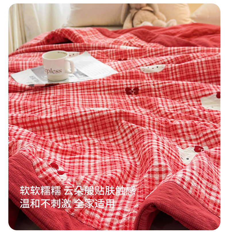 魅图家纺 2026新款泡芙纱新疆棉花夏被 红格小猫