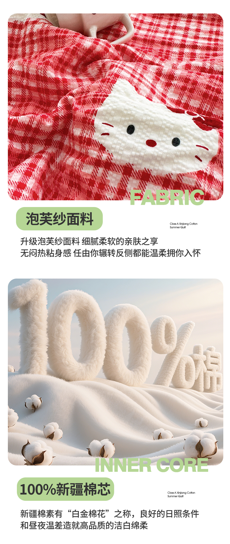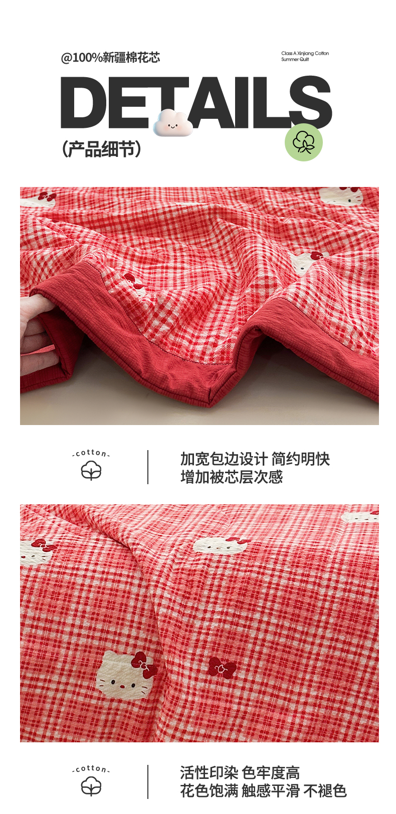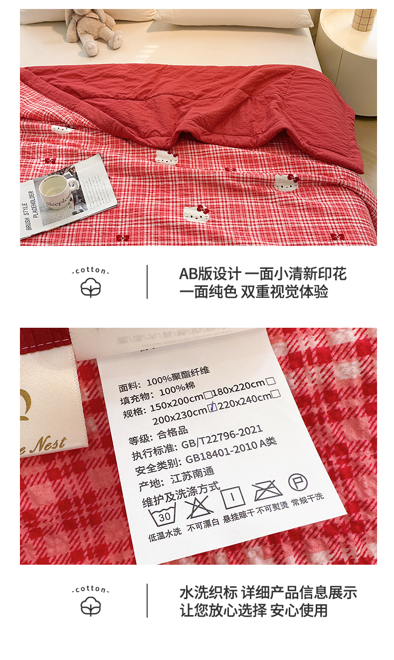 商品名称:魅图家纺 2026新款泡芙纱新疆棉花夏被 红格小猫