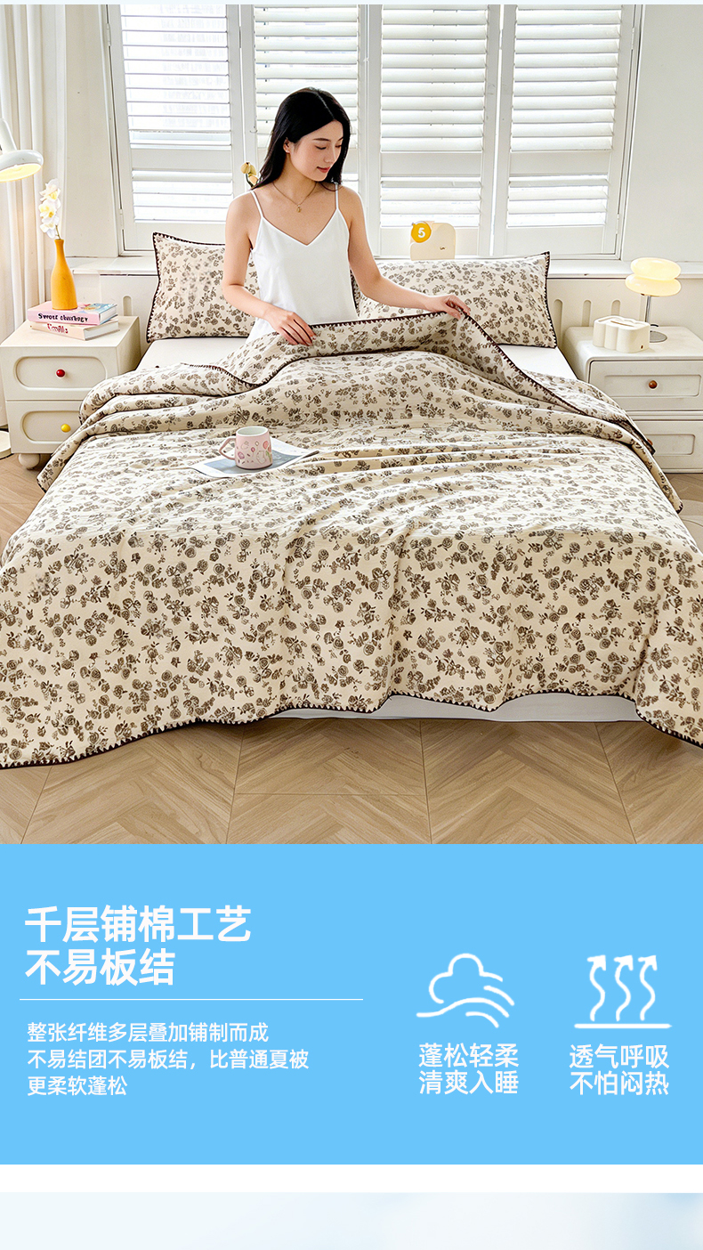 商品名称:锦尚坊被芯馆 2026新款100%棉花双层纱夏被新疆棉花空调被可机洗夏凉被绣边踩棉工艺 绽放