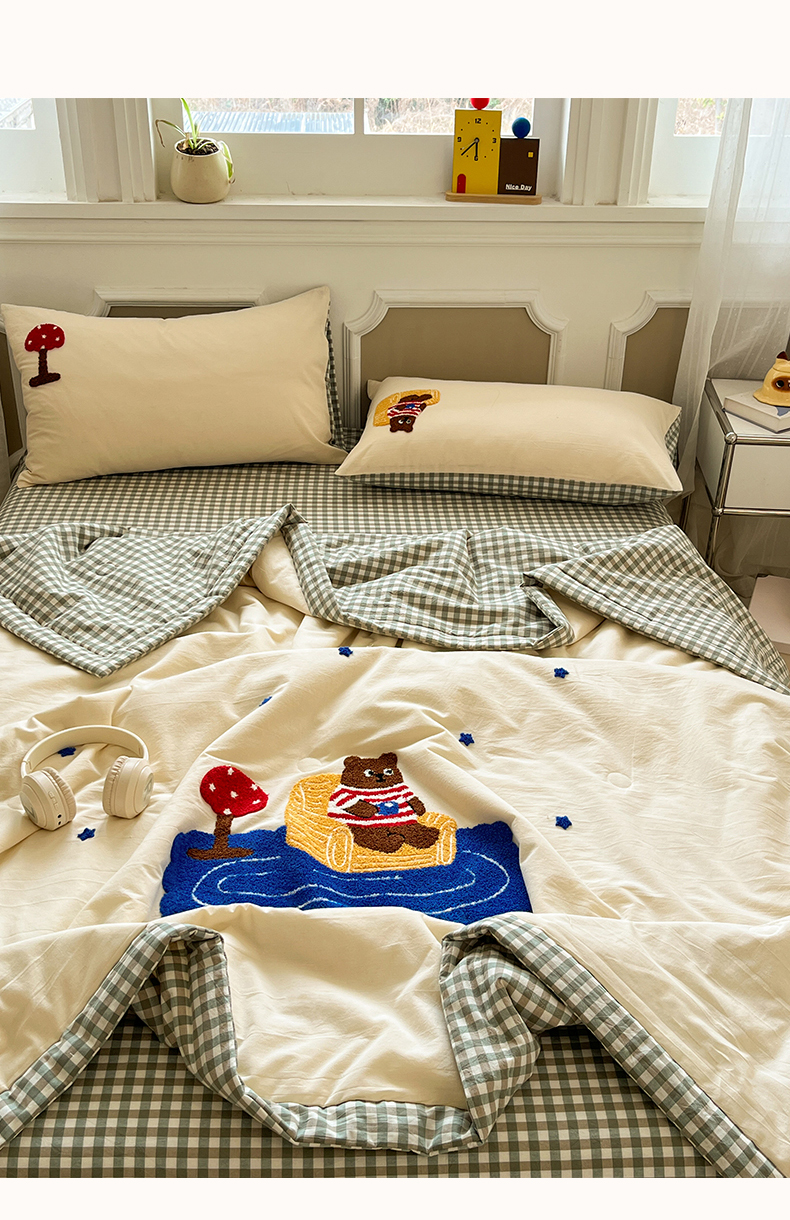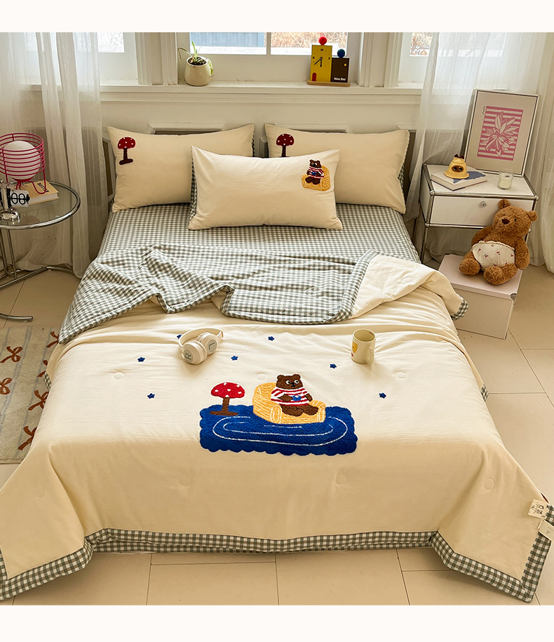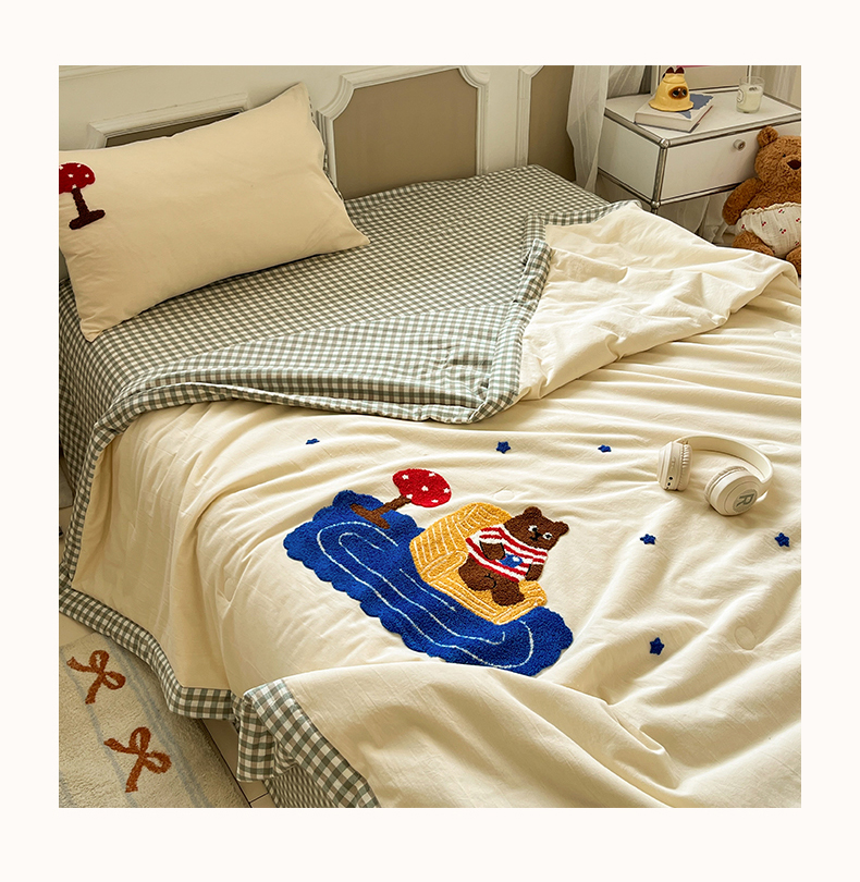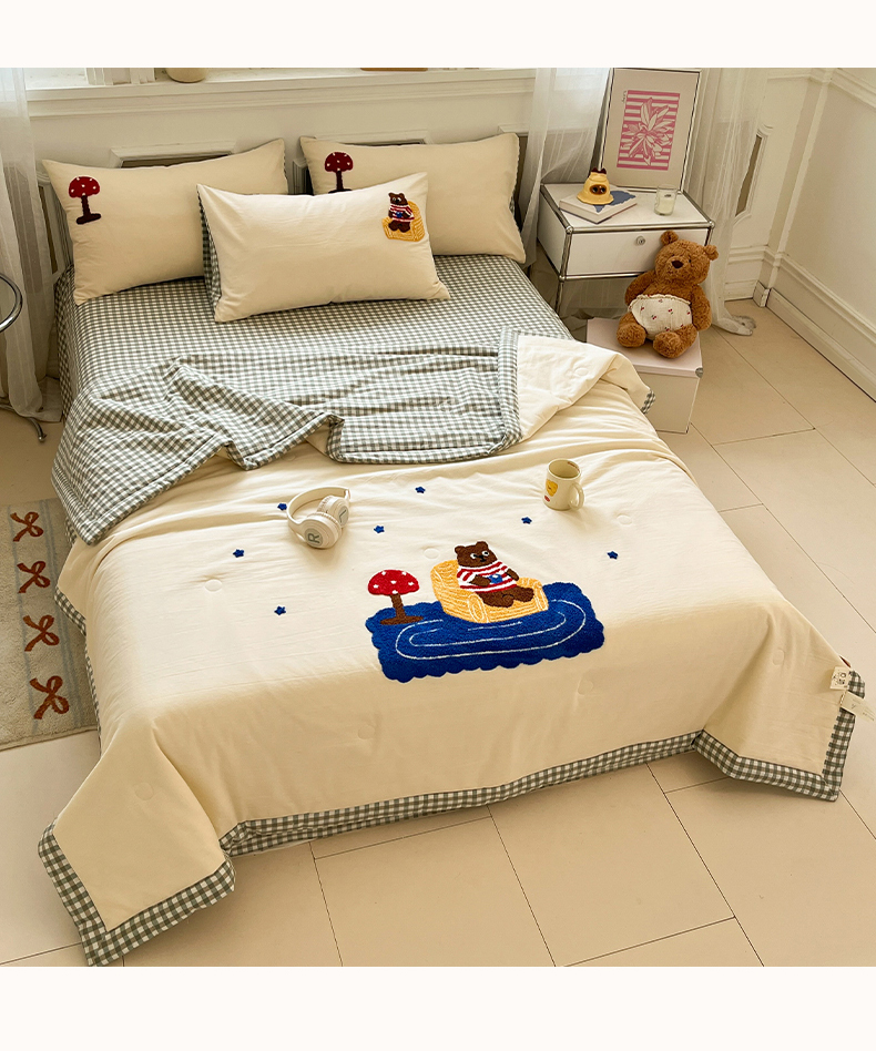 • 91家纺网 家纺一手货源 找家纺 一加一 2026新款全棉色织水洗棉毛巾绣大豆夏被夏凉被空调被四件套-闲趣小熊 闲趣小熊-格小绿