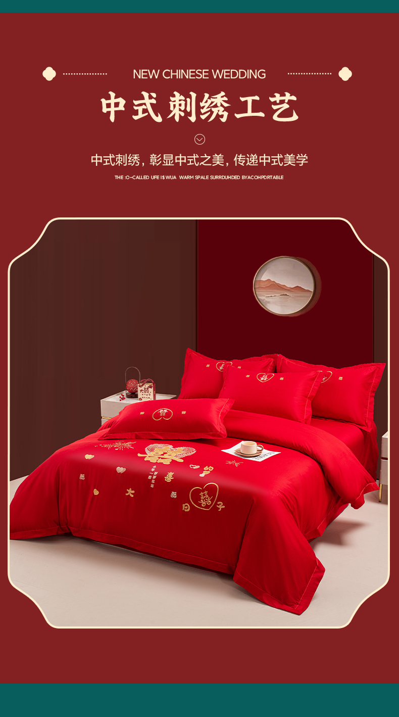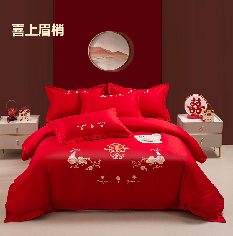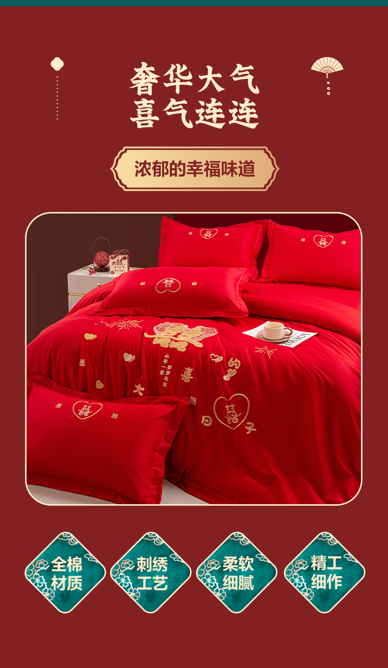 (总)银石 2024新款60新疆长绒棉大红婚庆绣花四件套,倾心一片,山河见证,心心相印,永结同心,浪漫时刻,吉祥如意,龙凤报喜